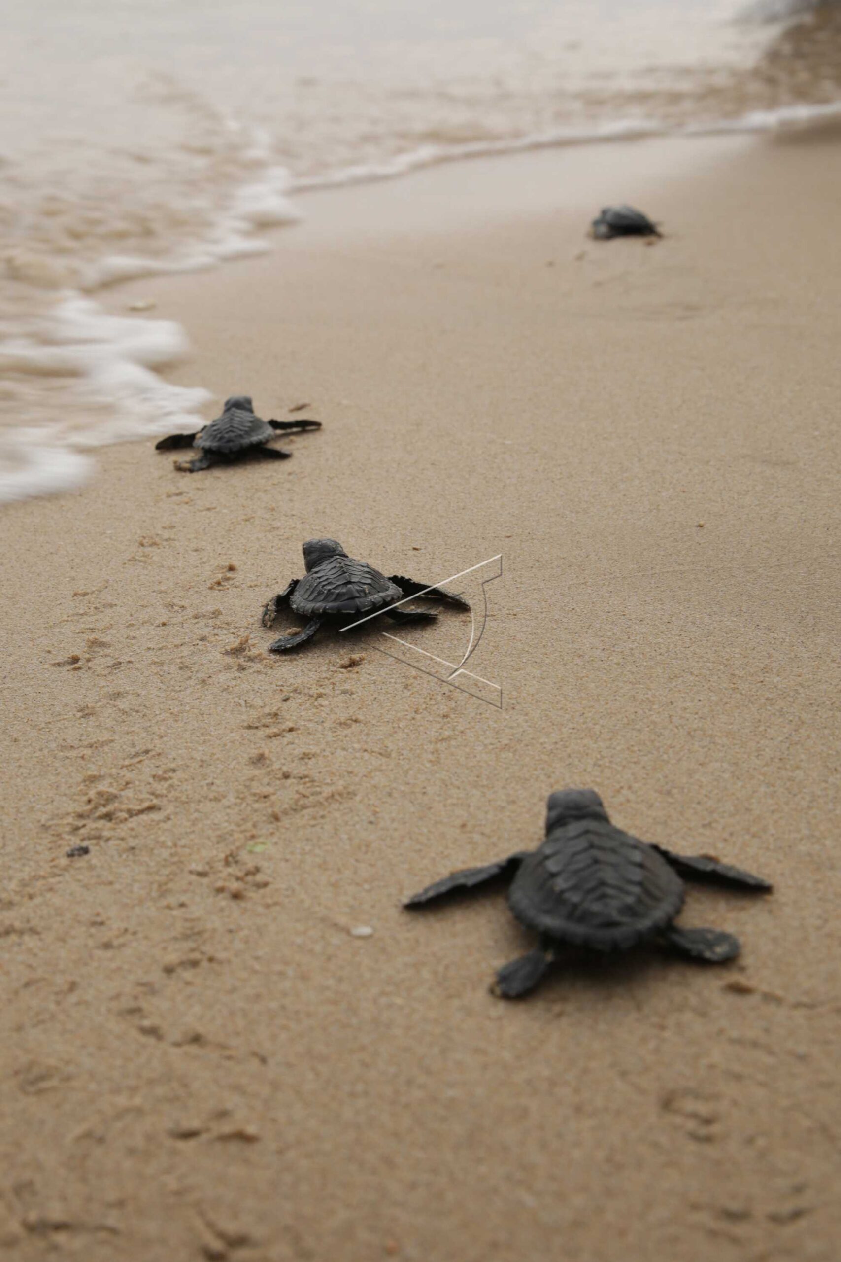 Seekor anak penyu (tukik) lekang hasil penangkaran tim konservasi penyu Aroen Meubanja berjalan menuju laut saat dilepas di Pantai Alue Piet, Panga, Aceh Jaya, Aceh, Sabtu (26/1/2019). ANTARA FOTO/Irwansyah Putra/dw/tom.