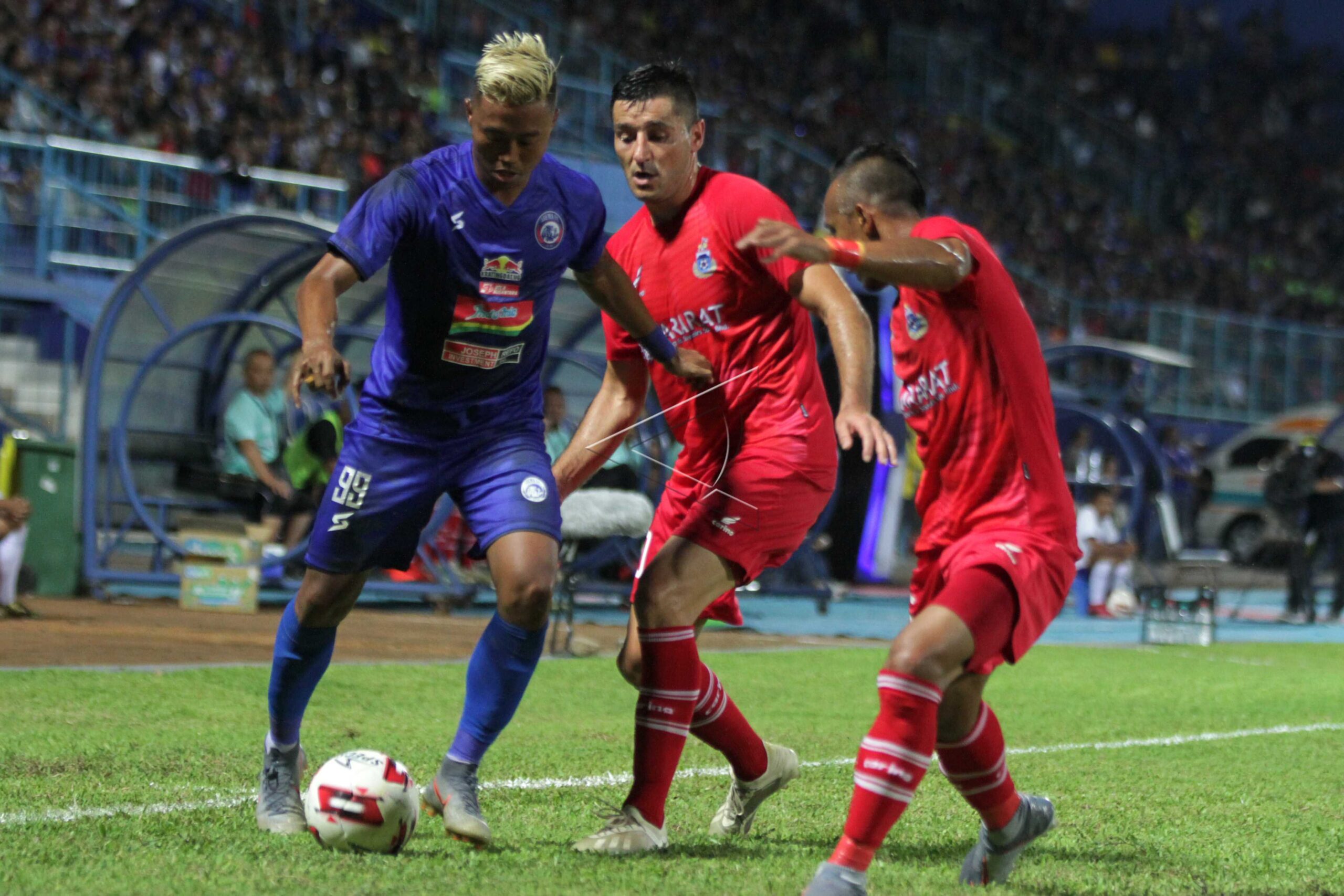 Pesepakbola Arema FC, Yodo (kiri) berusaha melewati hadangan penjaga gawang Sabah FA-Malaysia, Rozaimie Rohim (kanan) dalam pertandingan Piala Gubernur Jatim Grup B di Stadion Kanjuruhan, Malang, Jawa Timur, Selasa (11/2/2020). Arema menaklukkan Sabah FA dengan skor akhir 2-0. ANTARA FOTO/Ari Bowo Sucipto/pras.