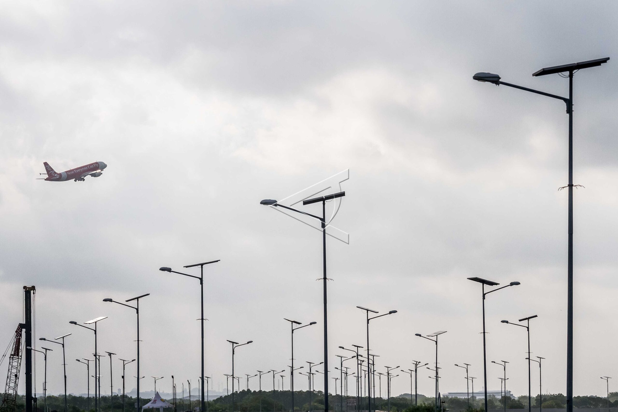 Sebuah pesawat lepas landas berlatar deretan lampu penerangan jalan umum berpanel surya di kawasan Bandara Baru Ahmad Yani di Semarang, Jawa Tengah, Minggu (11/2/2018). ANTARA FOTO/Aji Styawan/dw/pras.
