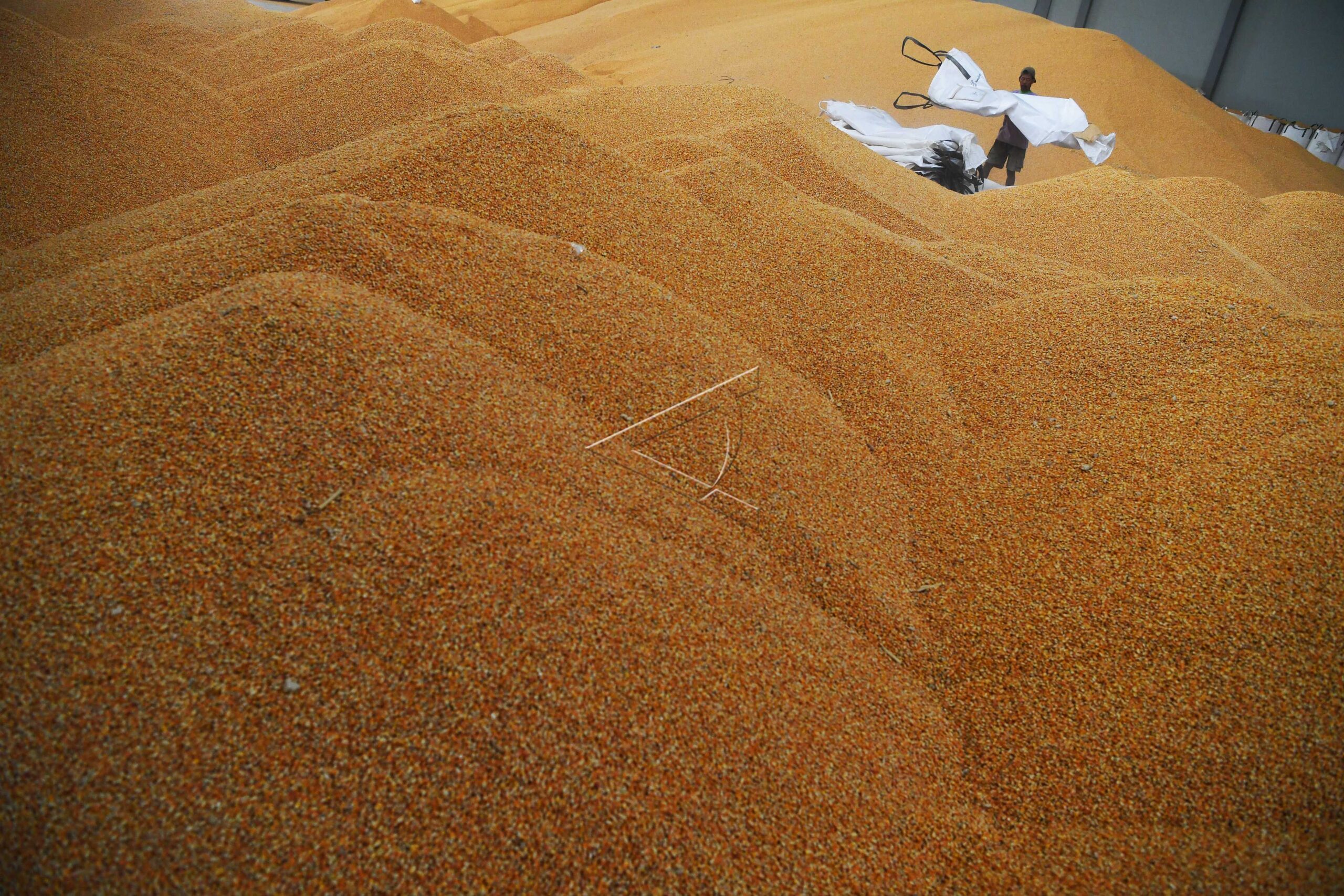 Pekerja mengemas jagung impor dari Brazil yang akan didistribusikan ke peternak di Gudang Bulog, Surabaya, Jawa Timur, Kamis (24/1/2019). ANTARA FOTO/Zabur Karuru/hp/dw/nym.
