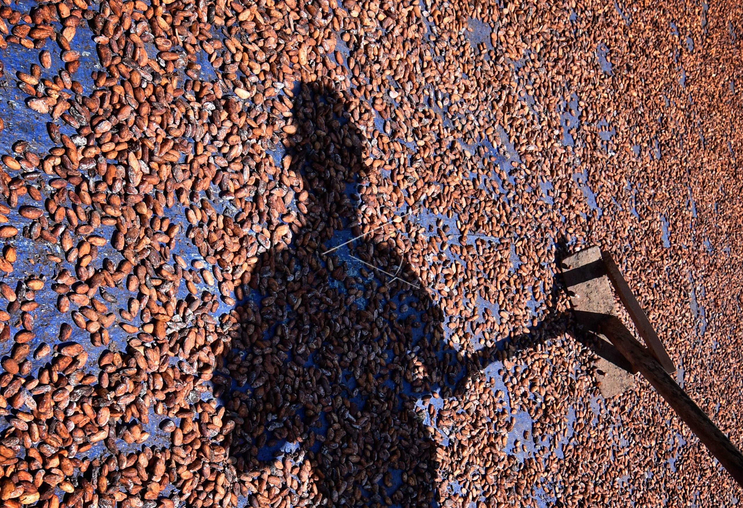 Bayangan petani saat menjemur biji kakao di Desa Sambik Bangkol, Kecamatan Gangga, Tanjung, Lombok Utara, NTB, Jumat (9/8/2019). ANTARA FOTO/Ahmad Subaidi/wsj/dw/nym.