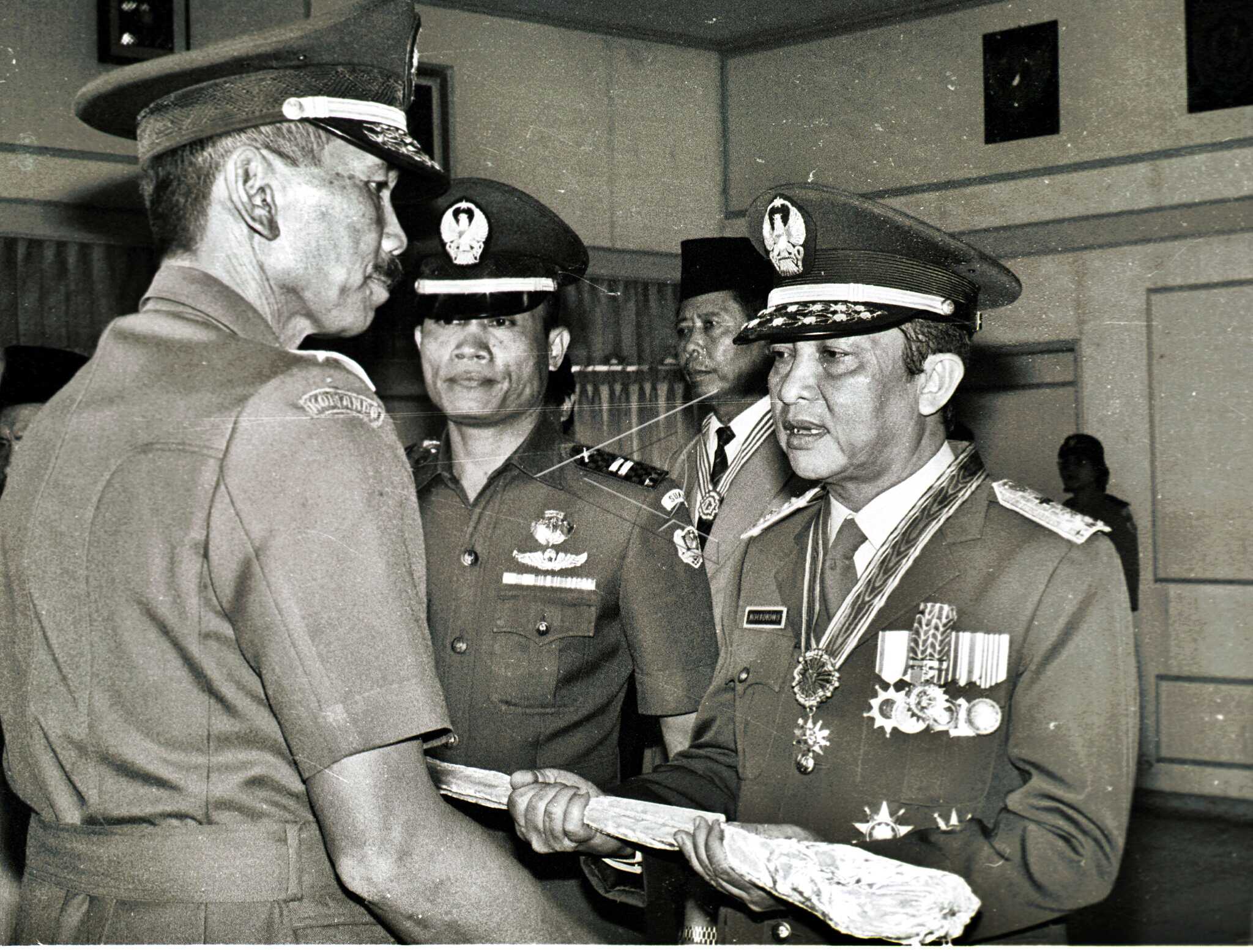 KASAD Jenderal TNI Edy Sudradjat (kiri) menyerahkan penghargaan Bintang Kartika Eka Paksi Pratama kepada Menteri Sekretaris Negara Mayjen TNI Moerdiono, di Jakarta, Kamis (19/7/1990). ANTARA FOTO/PF03/asf/tom.
