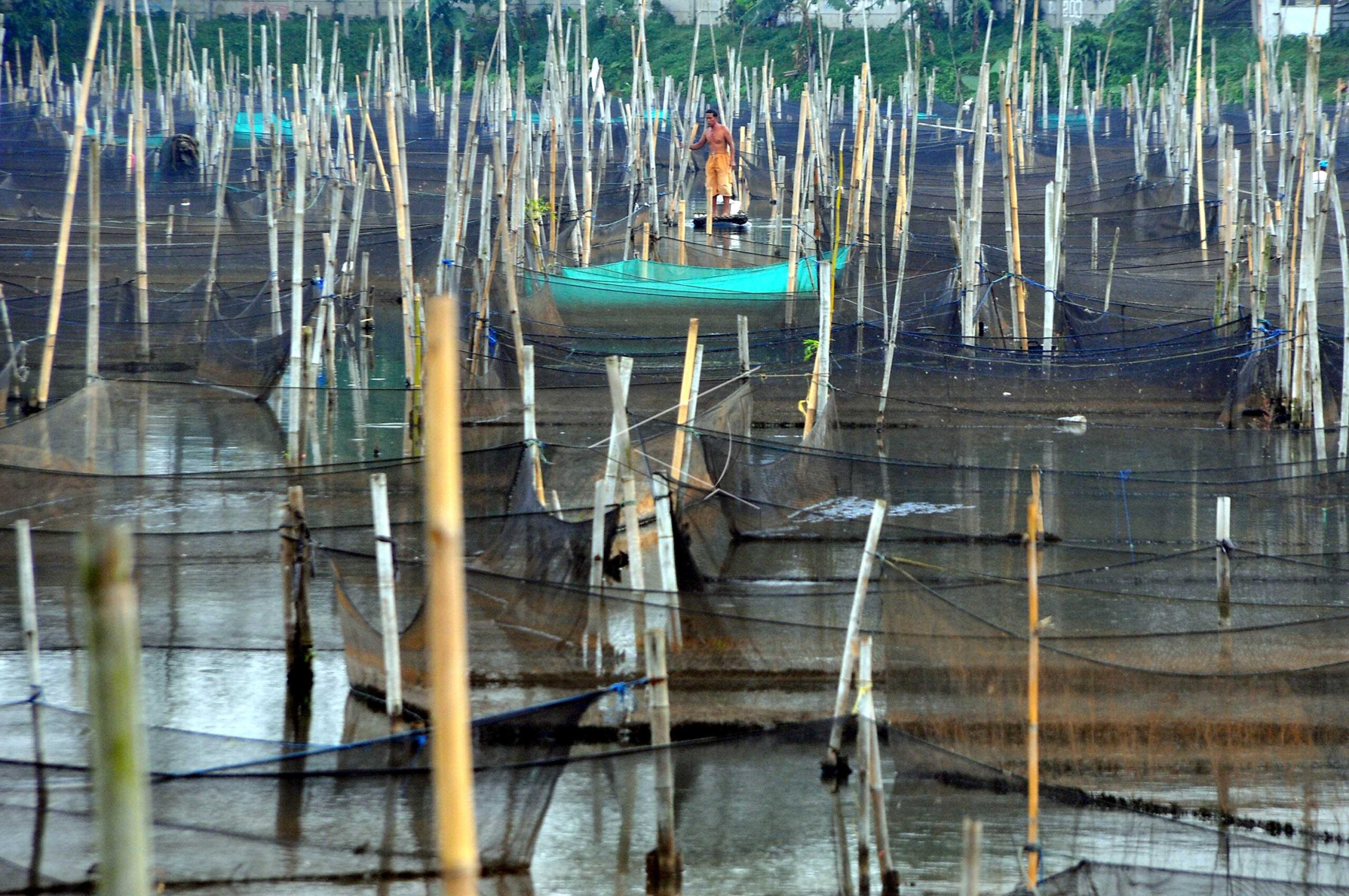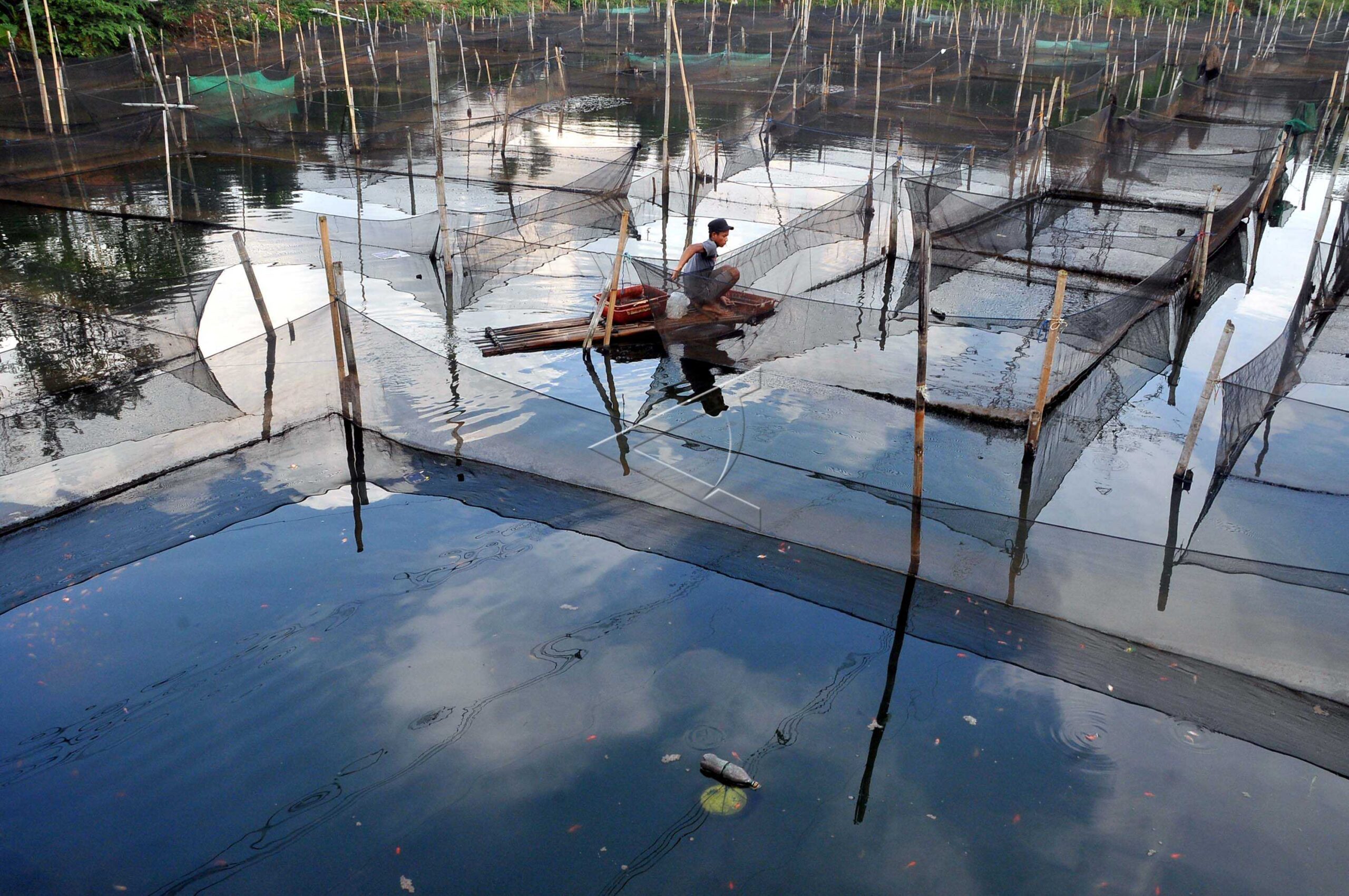 Peternak ikan hias air tawar memberi makan ikan di karamba di kawasan Ciseeng, Bogor, Jawa Barat, Selasa (10/1/2017). ANTARAFOTO/Yulius Satria Wijaya/aww/dw/nym.