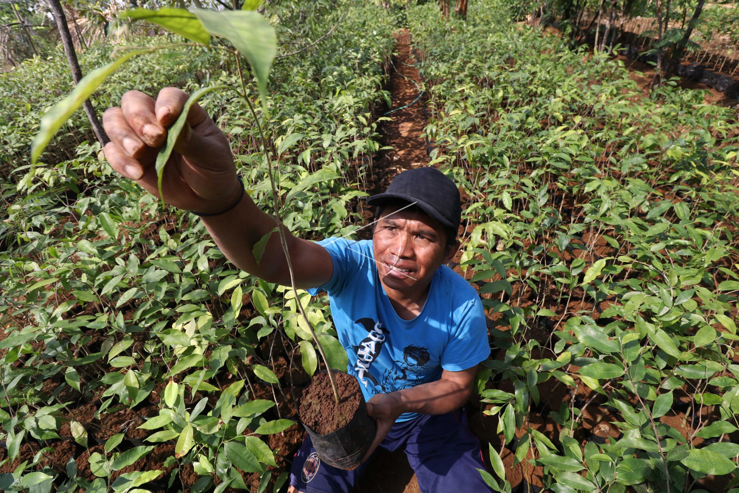 Petani melakukan perawatan rutin tanaman gaharu berumur satu tahun di lereng gunung Wilis, Desa Joho, Kediri, Jawa Timur, Kamis (30/8/2018). ANTARA FOTO/Prasetia Fauzani.