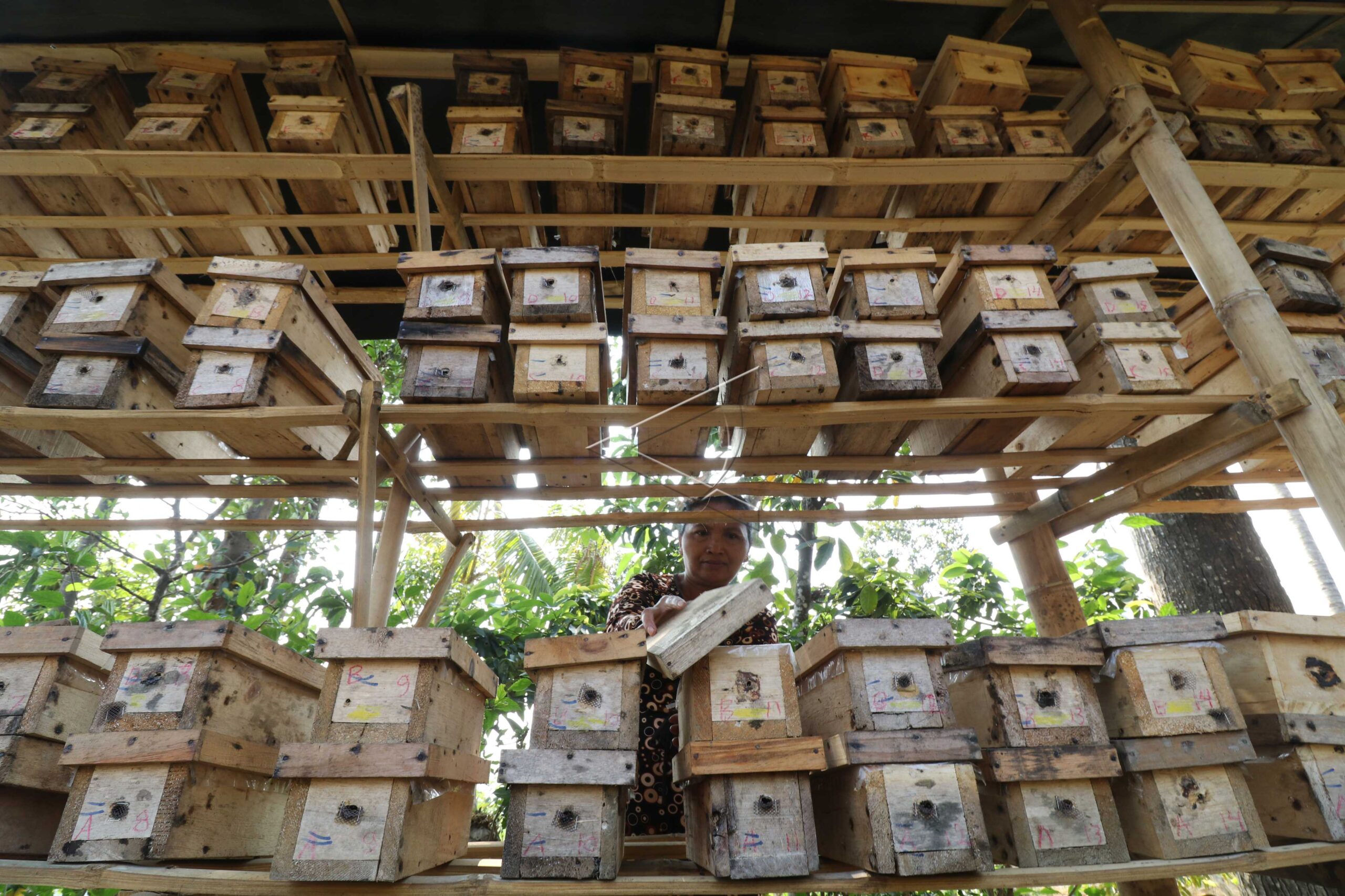 Peternak memperlihatkan sarang lebah Lanceng penghasil madu di Kampung Madu Desa Joho, Kediri, Jawa Timur, Kamis (30/8/2018). ANTARA FOTO/Prasetia Fauzani.