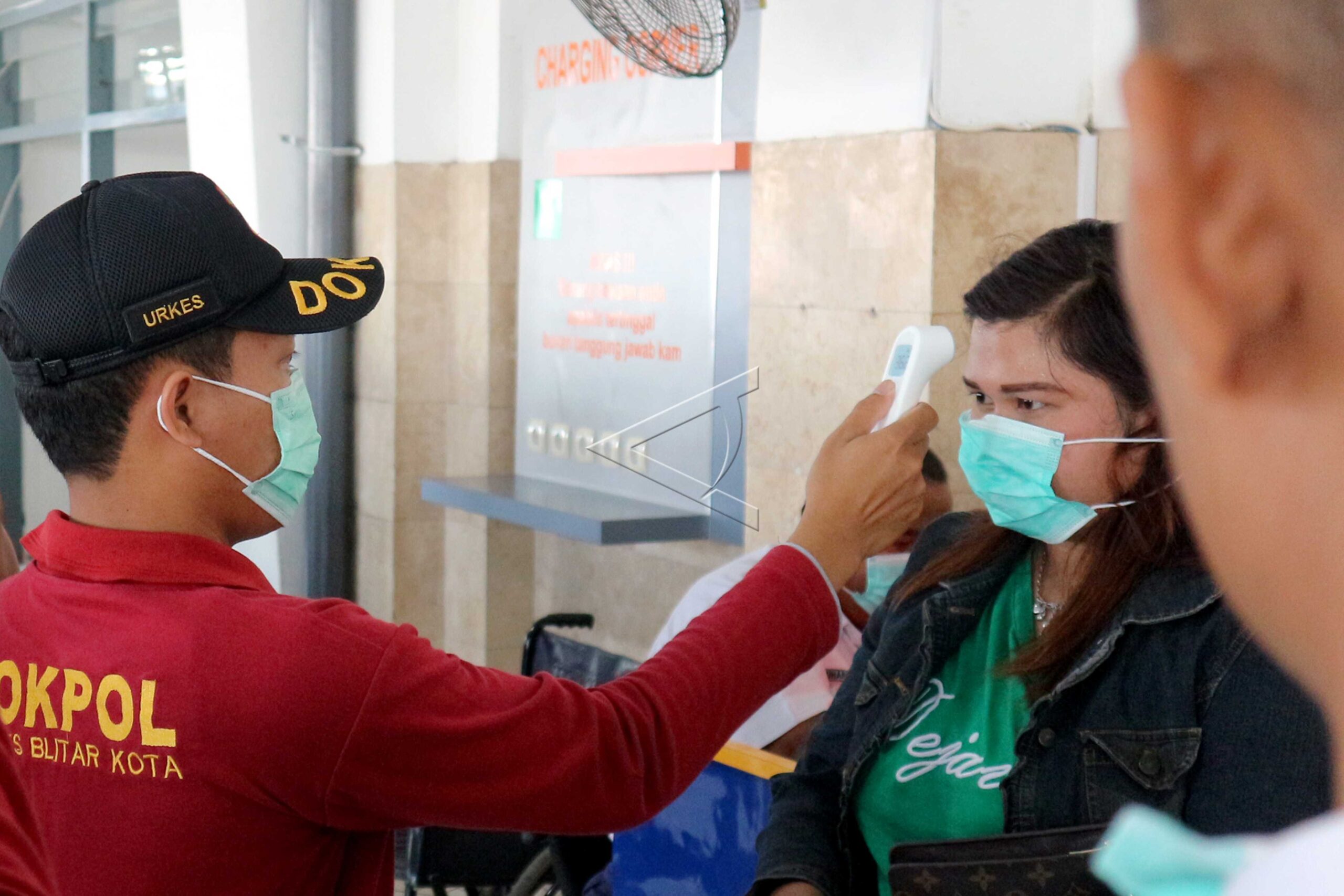 Personel polisi menyemprotkan cairan disinfektan saat bakti sosial Polres Blitar Kota di Stasiun Kereta Api (KA) Blitar, Jawa Timur, Sabtu (14/3/2020). Polres Blitar Kota melakukan bakti Sosial di kawasan Stasiun KA Blitar dengan memyemprotkan cairan disinfektan dan mengukur suhu tubuh calon penumpang untuk mencegah penyebaran virus Corona (COVID-19). ANTARA FOTO/Irfan Anshori/wsj.