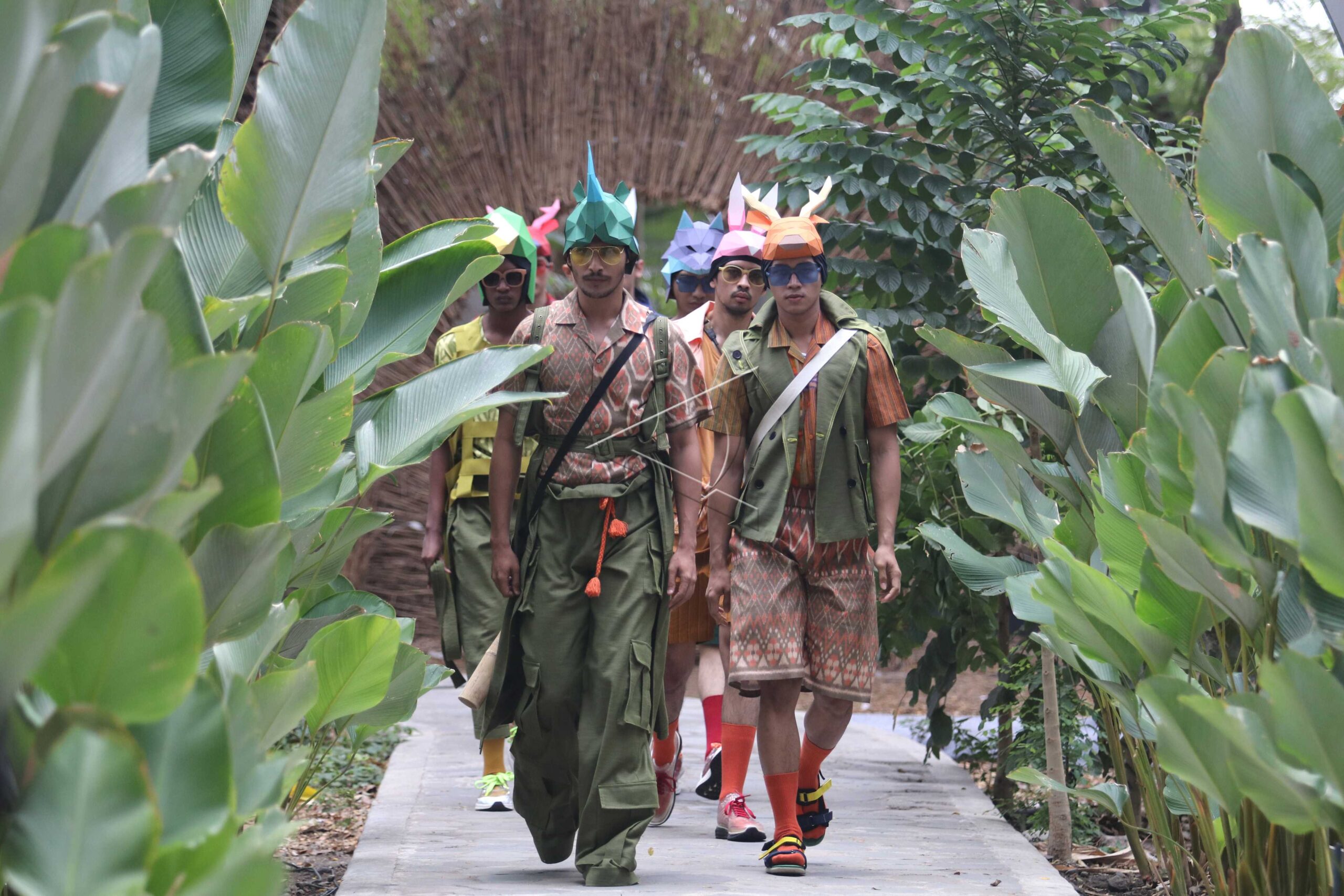 Model memperagakan busana berbahan kain tenun ikat khas Kediri pada Dhoho Street Fashion bertema Pride of Jayabaya di Taman Hutan Joyoboyo, Kota Kediri, Jawa Timur, Kamis (5/12/2019). ANTARA FOTO/Prasetia Fauzani/hp/dw/nym.
