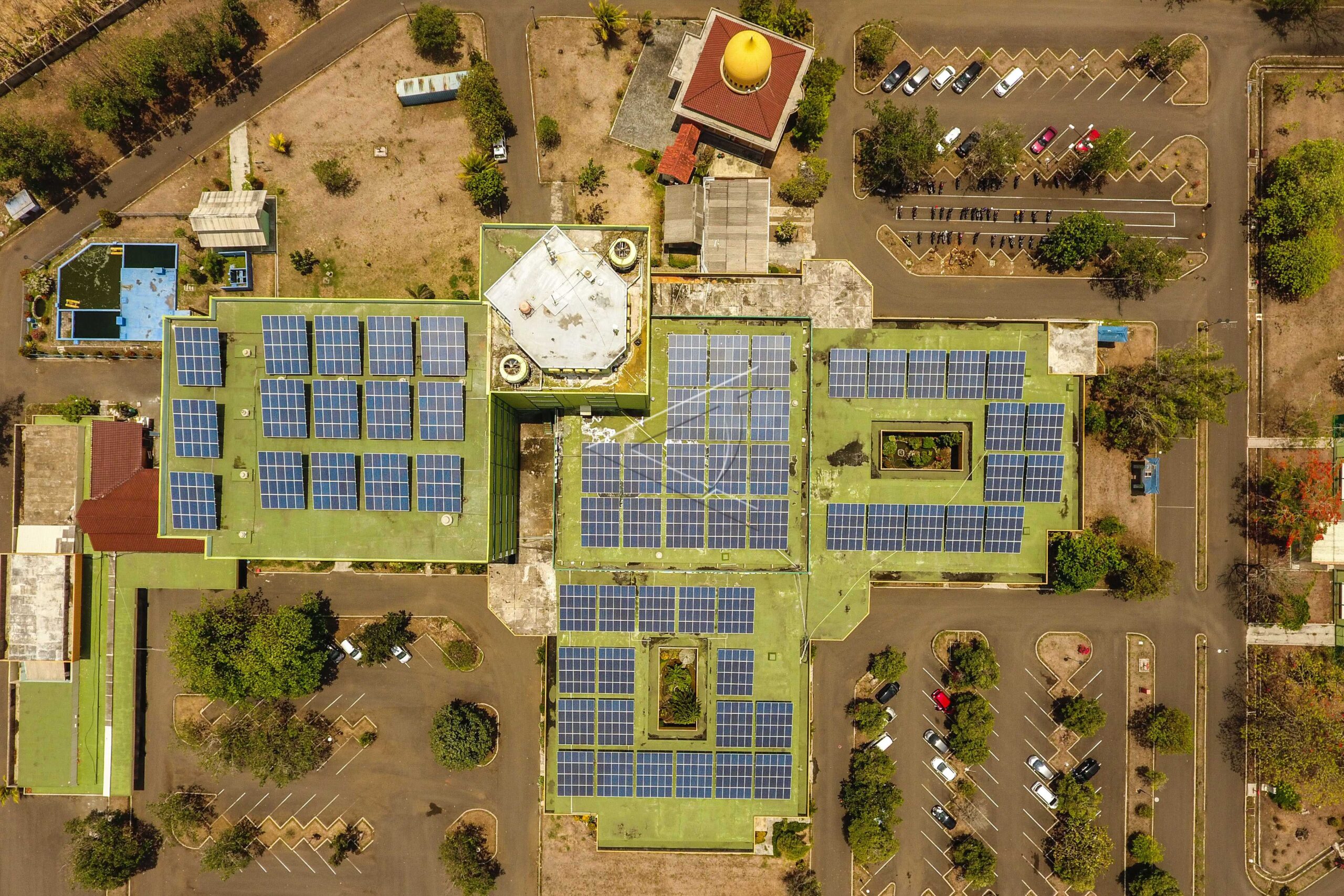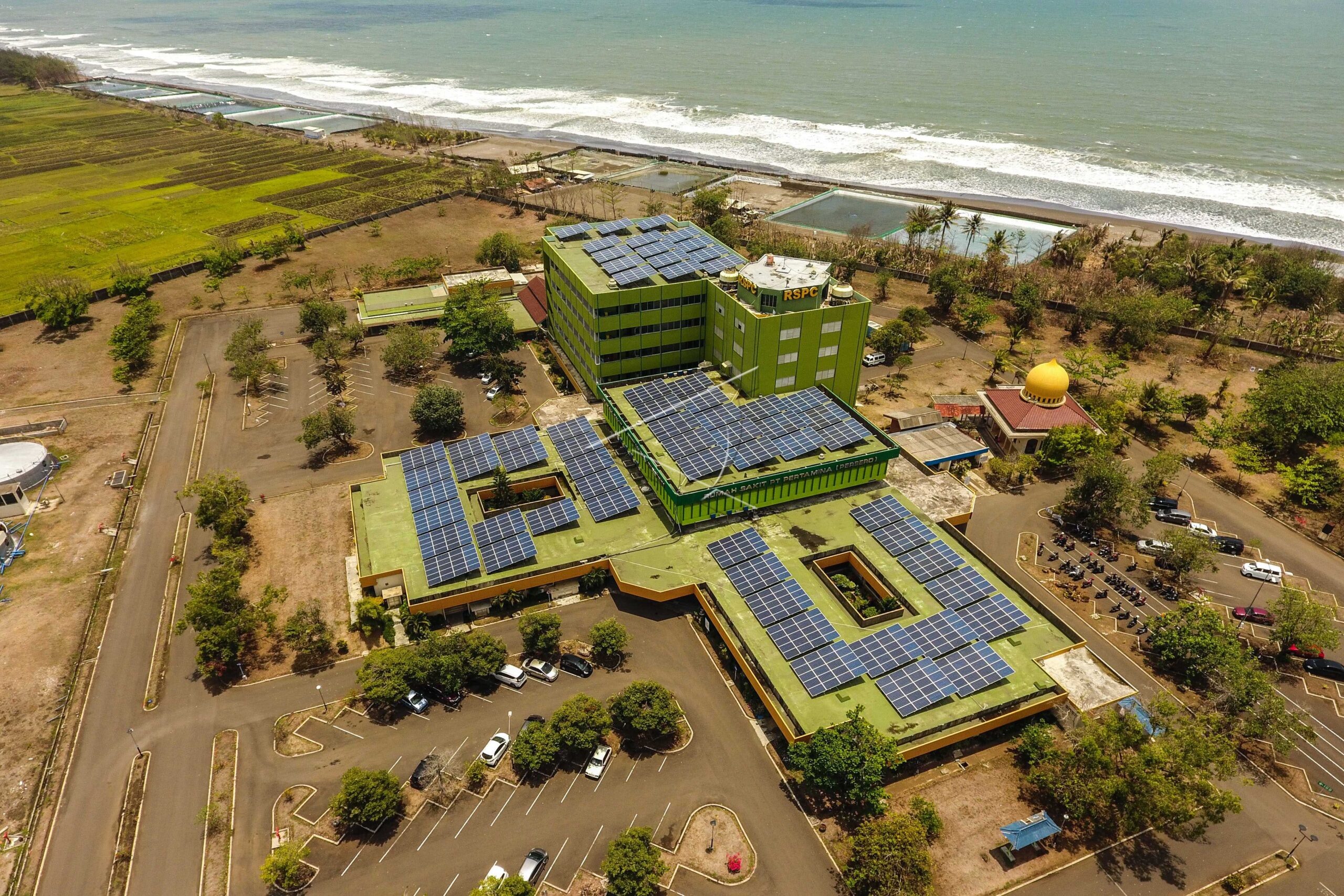 Foto udara instalasi Pembangkit Listrik Tenaga Surya, yang di pasang sebagai sumber energi baru terbarukan (EBT) di Rumah Sakit Pertamina Cilacap, Jawa Tengah, Jumat (26/10/2018). ANTARA FOTO/Idhad Zakaria/dw/pras.