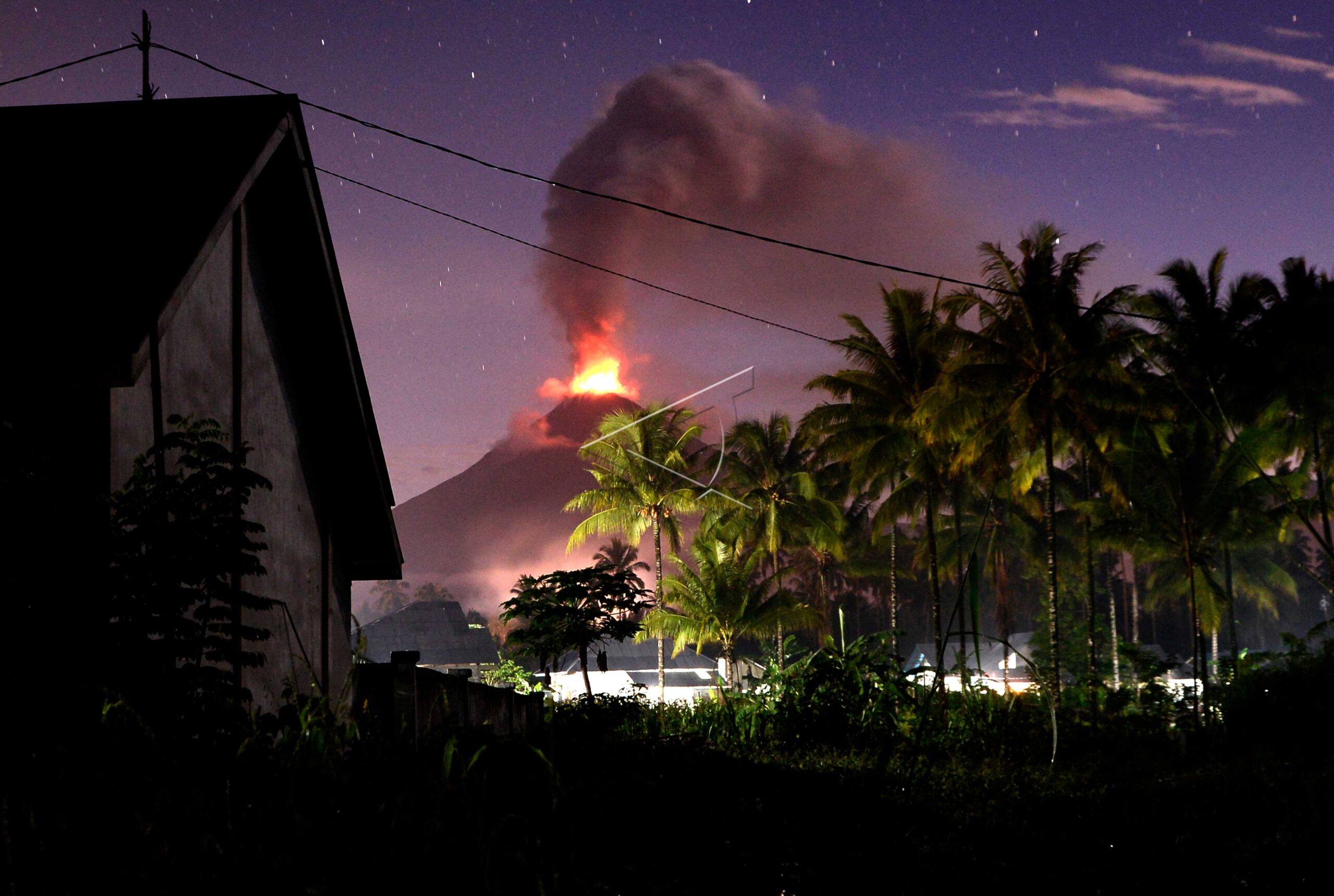 Gunung Soputan menyemburkan lava pijar dan debu vulkanis terlihat dari Desa Silian 3, Minahasa Tenggara, Sulawesi Utara, Selasa (5/1/2016). ANTARA FOTO/Adwit B Pramono/dw/pras.