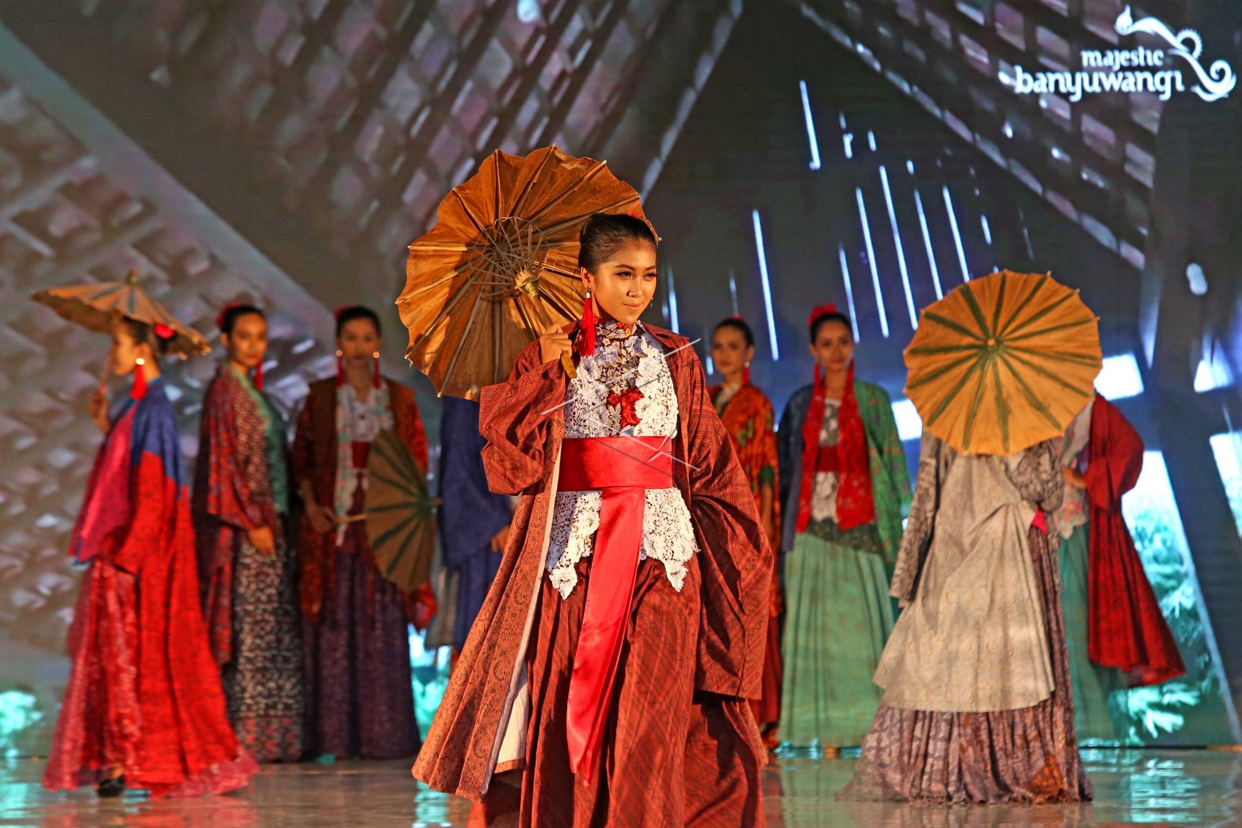 Model memperagakan busana pada Festival Kebaya yaitu ajang dari 100 karya kebaya semi modern hasil kolaborasi perancang nasional dengan desainer lokal Banyuwangi di Banyuwangi, Jawa Timur, Rabu (5/12/2018). ANTARA FOTO/Budi Candra Setya/kye/dw/nym.