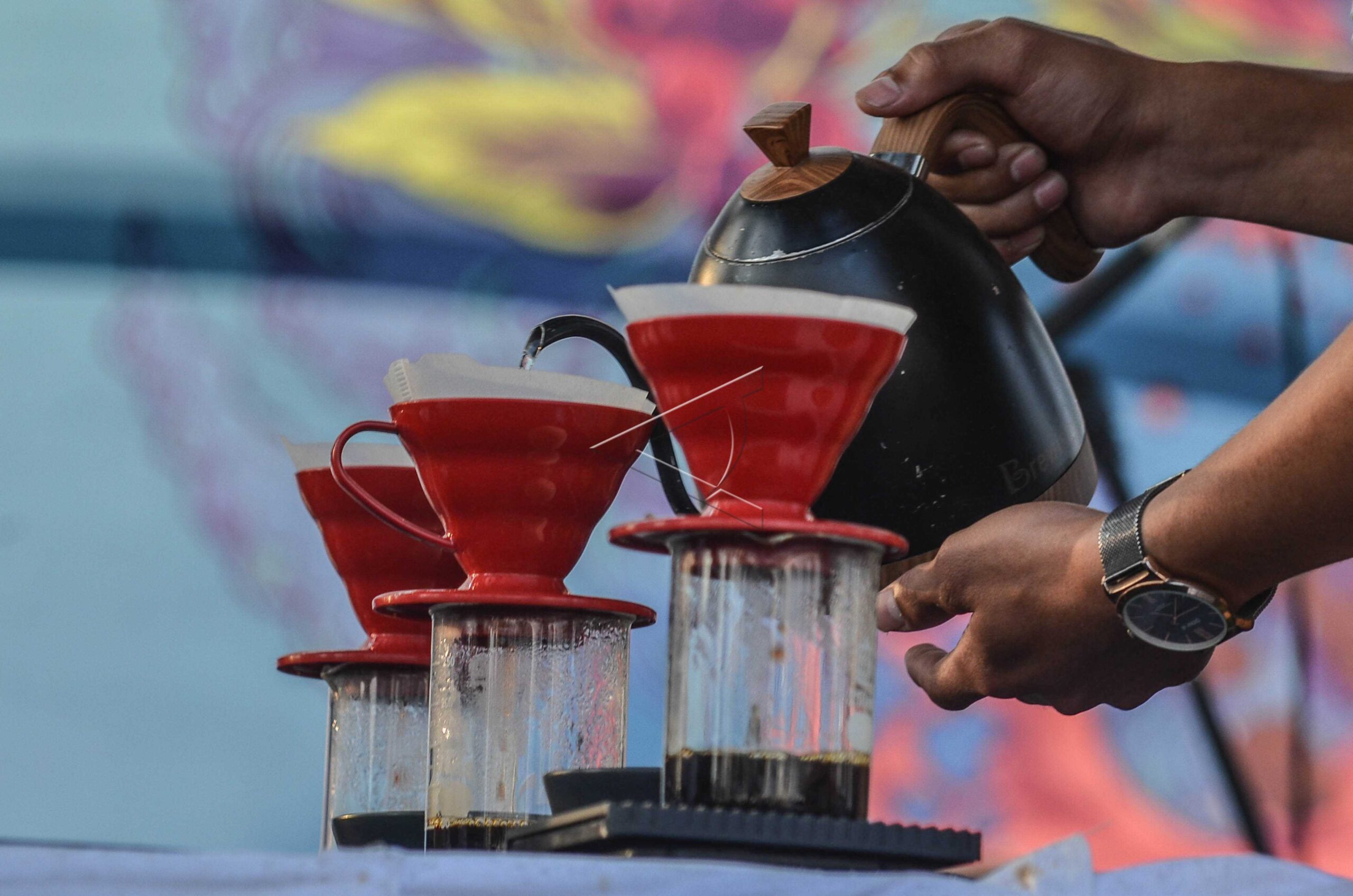 Peserta mengikuti lomba barista pada acara Festival Kopi Pangandaran di Lapang Grand Pangandaran, Jawa Barat, Sabtu (26/10/2019). ANTARA FOTO/Adeng Bustomi/foc/dw.