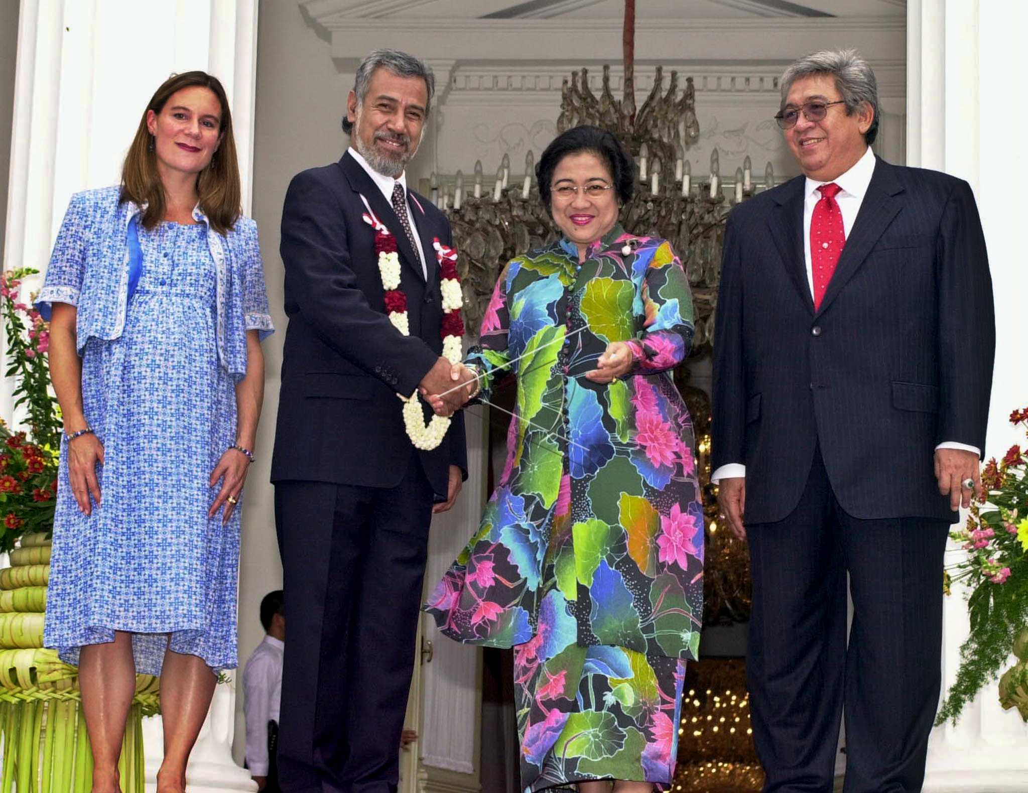 Presiden Megawati Soekarnoputri (kedua kanan) berjabat tangan dengan Presiden Republik Demokratik Timor Leste Xanana Gusmao (kedua kiri), didampingi Taufik Kiemas (kanan) dan Kyrsti Sword Gusmao (kiri), usai upcara penyambutan kenegaraan di Istana Merdeka, Jakarta, Selasa (2/7/2002). ANTARA FOTO/Hadiyanto/asf/tom.