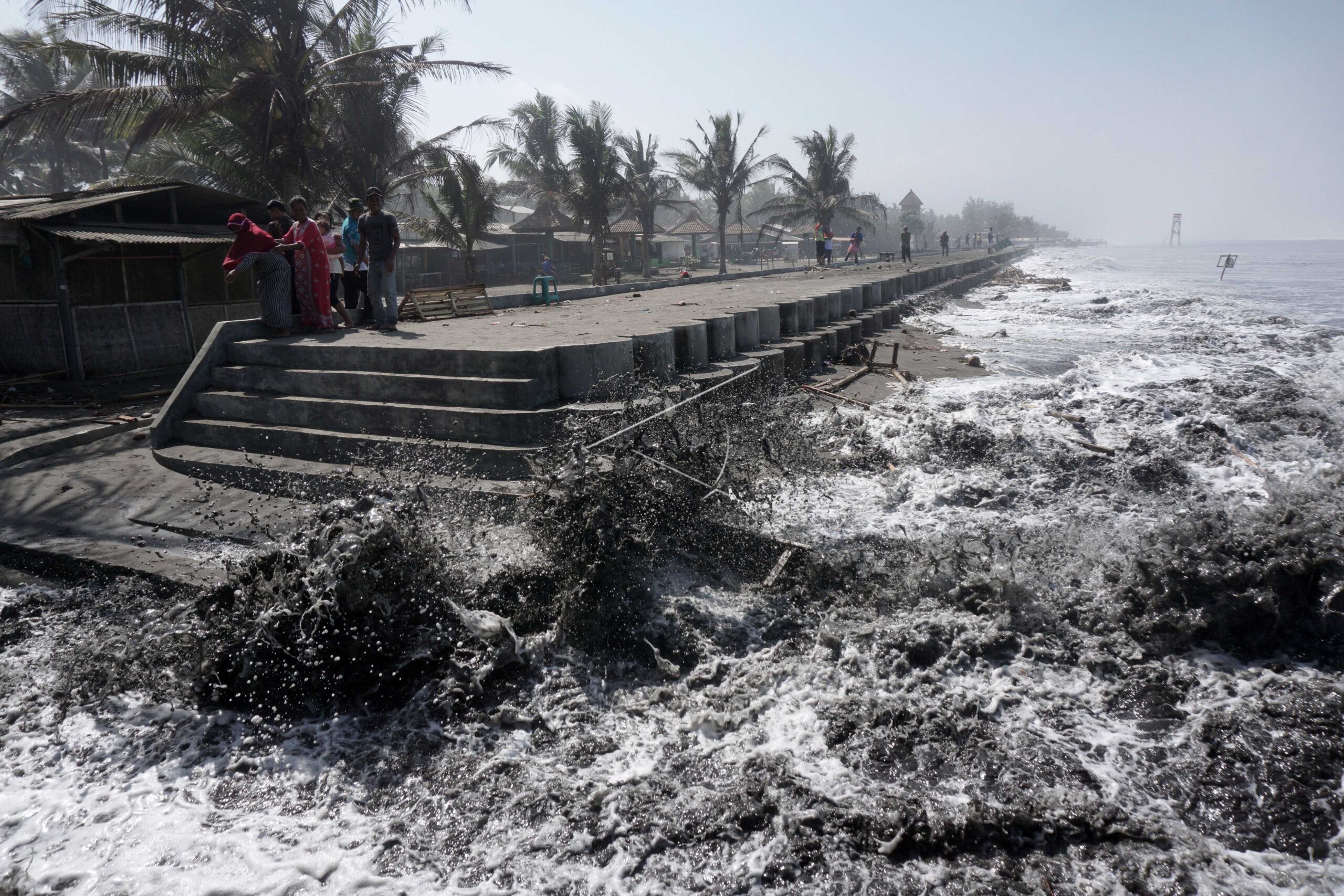 Sejumlah warga berusaha menghindar saat gelombang tinggi menerjang pemecah ombak di Pantai Widarapayung, Binangun, Cilacap, Jateng, Rabu (25/7/2018). ANTARA FOTO/Idhad Zakaria/dw/pras.