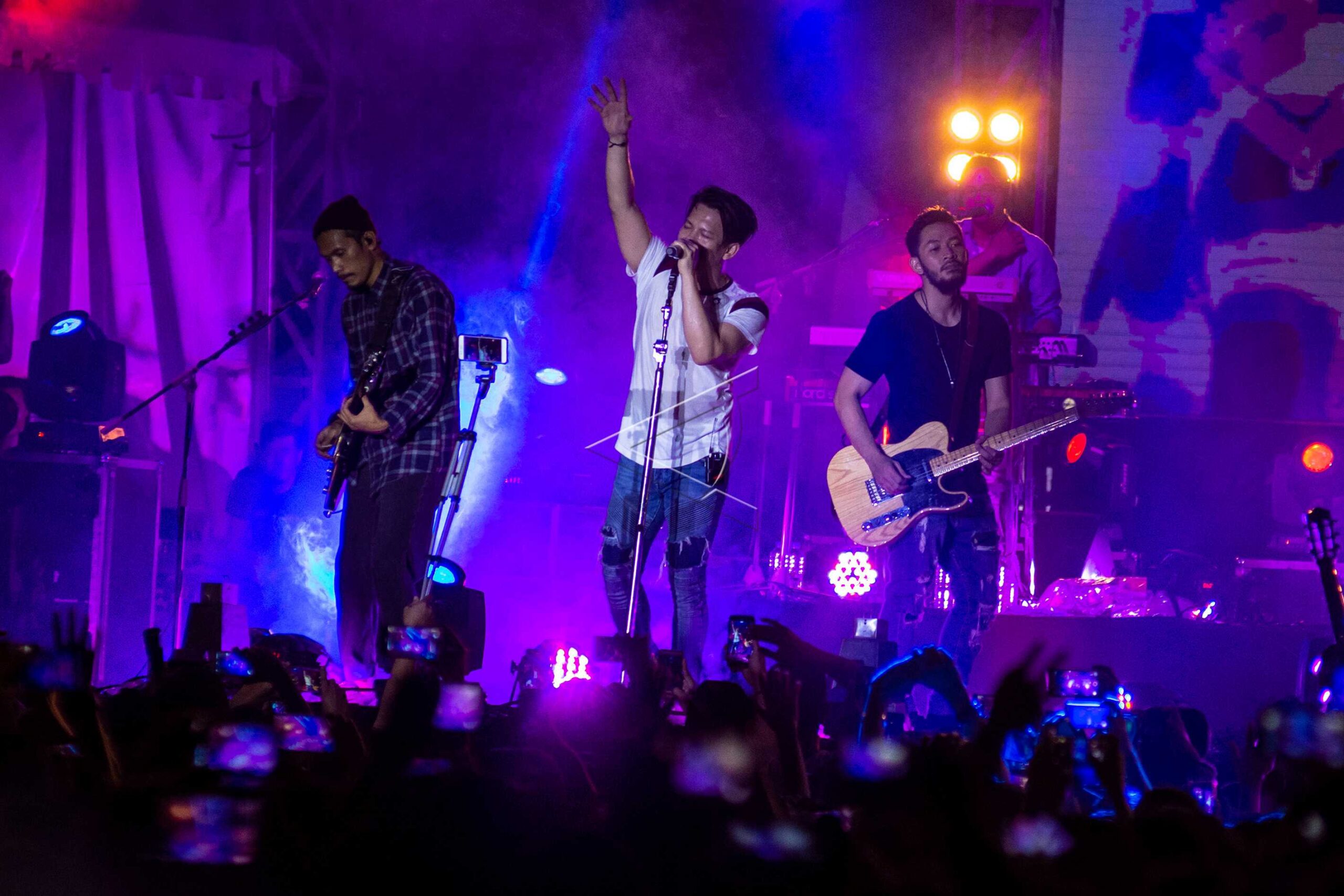 Personel awal grup Noah, Ariel (tengah), Lukman (kiri), Uki (kanan) tampil pada konser ‘Suryanation’ di Kota Pekanbaru, Riau, Sabtu malam (10/11/2018). ANTARA FOTO/FB Anggoro/nz/dw/wpa.