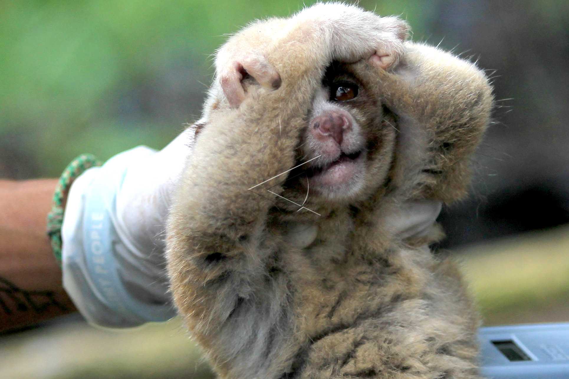 Petugas dari Yayasan Inisiasi Alam Rehabilitasi Indonesia memeriksa kukang Jawa (Nycticebus javanicus) yang akan dipindahkan ke kandang habituasi di Kawasan Taman Nasional Gunung Ciremai, Kuningan, Jawa Barat, Senin (8/5/2017). ANTARA FOTO/Dedhez Anggara/nz/dw/17.