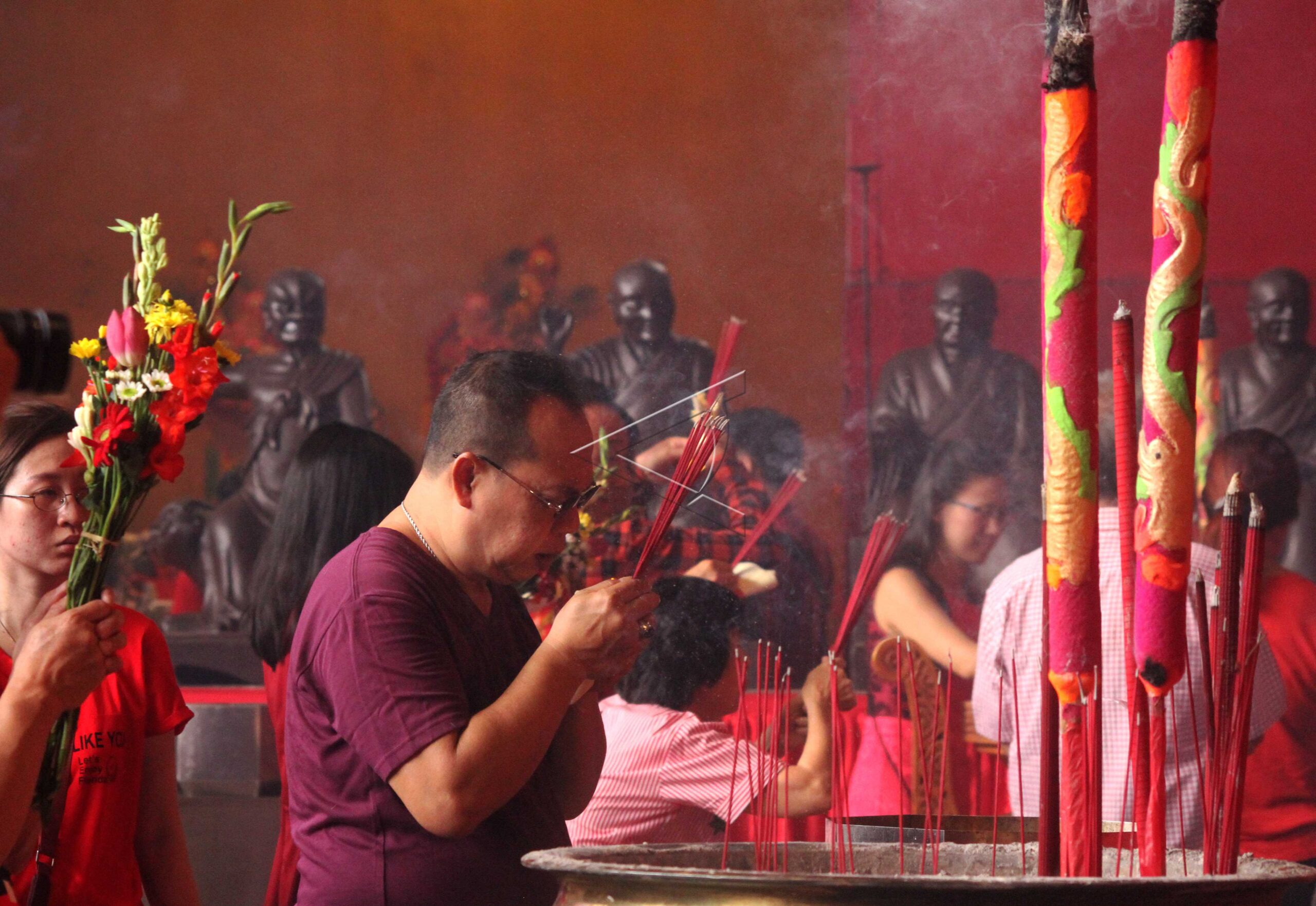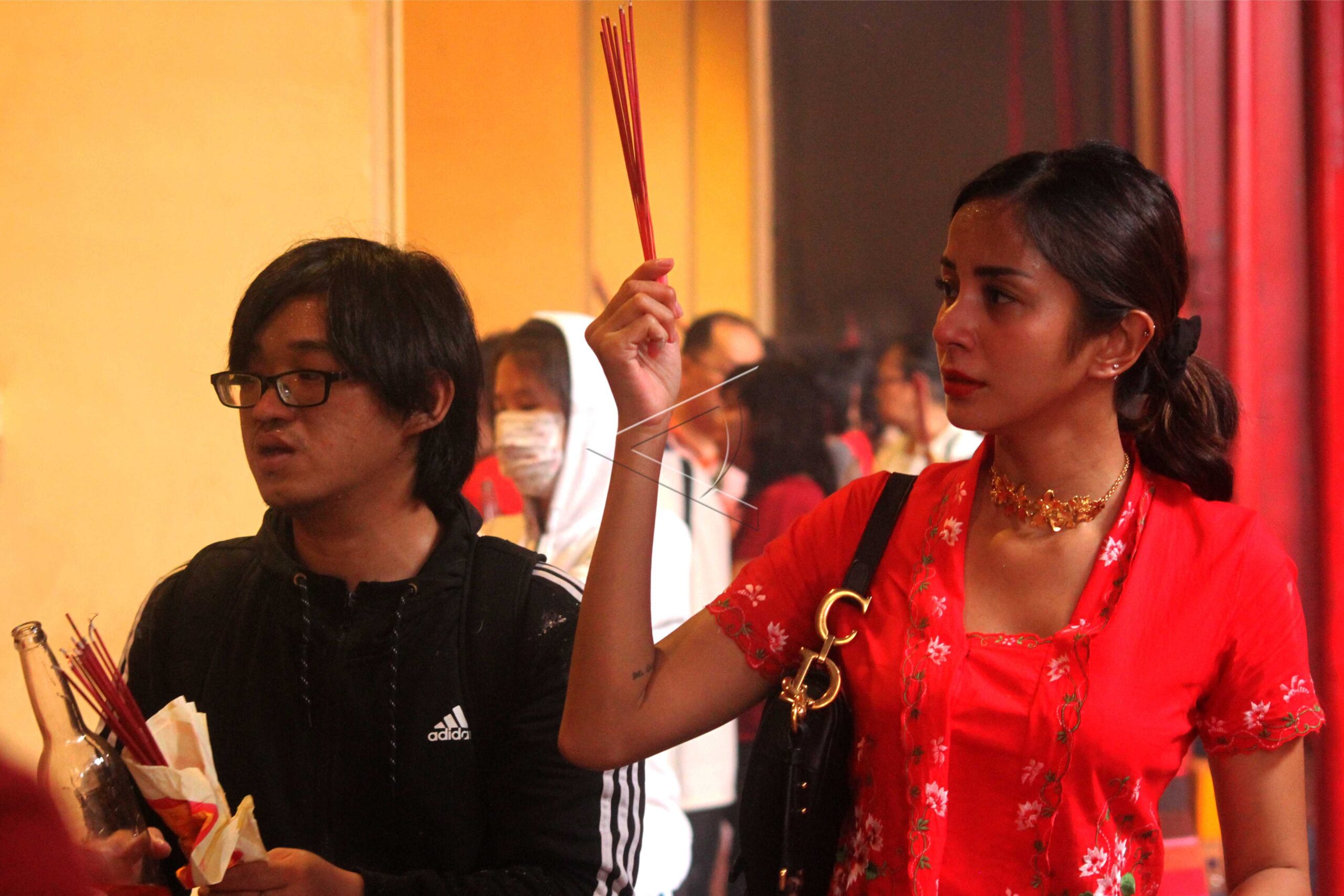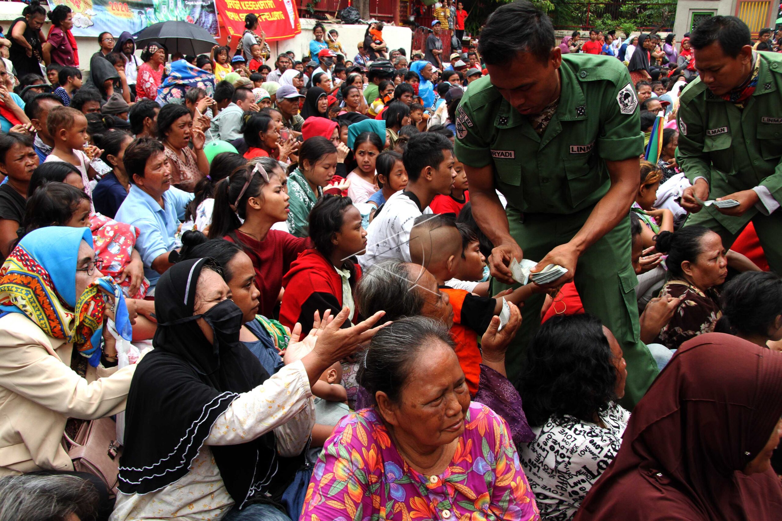 Petugas keamanan membagikan angpao kepada warga sekitar pada perayaan tahun baru Imlek 2571, di Klenteng Petak Sembilan, Jakarta, Sabtu (25/1/2020). Tahun Baru Imlek 2571 yang jatuh pada tahun Tikus Logam tersebut dimaknai menurut kepercayaan etnis tionghoa sebagai simbol keberuntungan dan kesuburan. ANTARA FOTO/Risky Andrianto/hp.