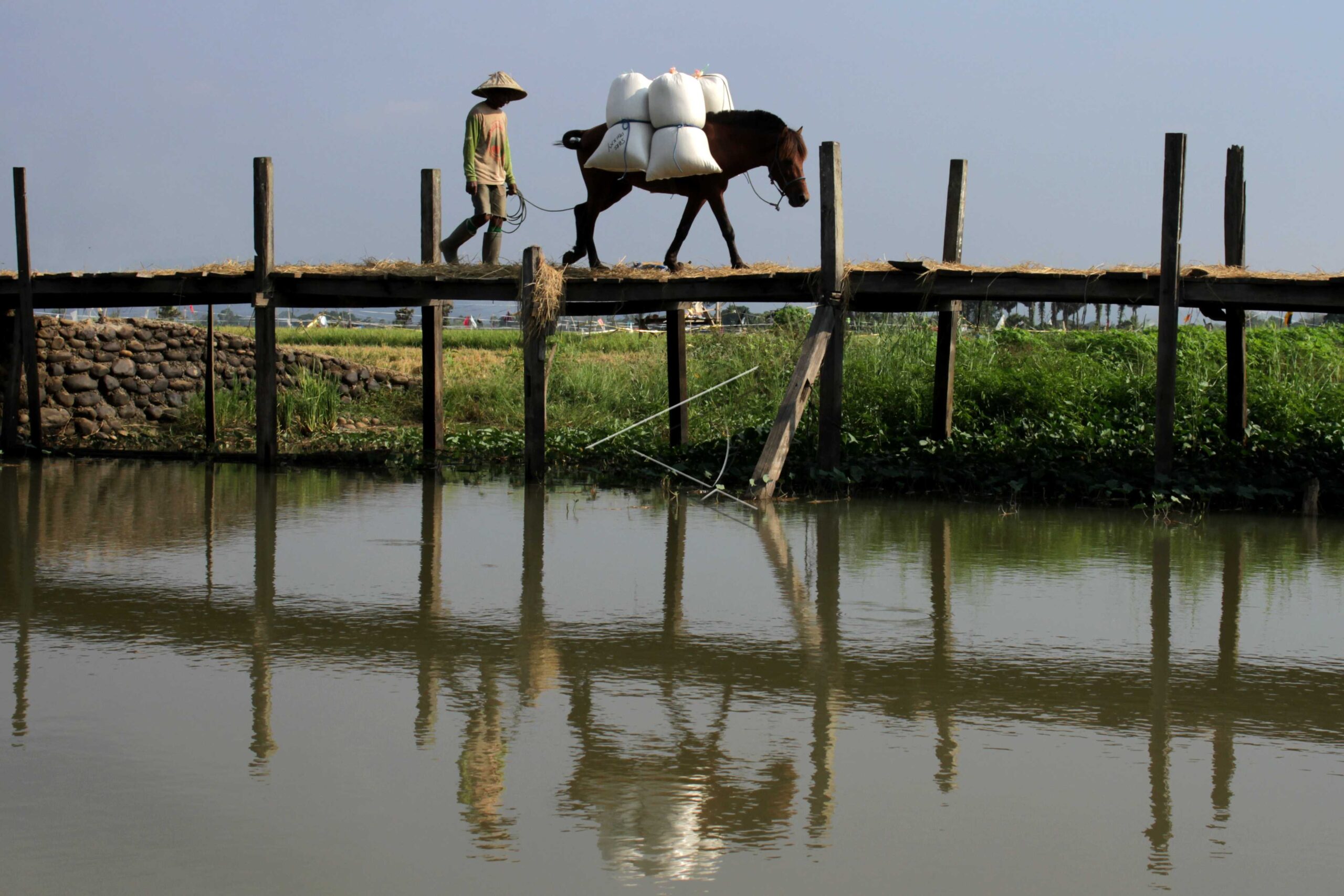 Warga menggiring kudanya yang disewa untuk mengangkut karung berisi gabah milik petani di Kecamatan Manggala, Makassar, Sulawesi Selatan, Jumat (29/11/2019). ANTARA FOTO/Arnas Padda/aww/dw/nym.