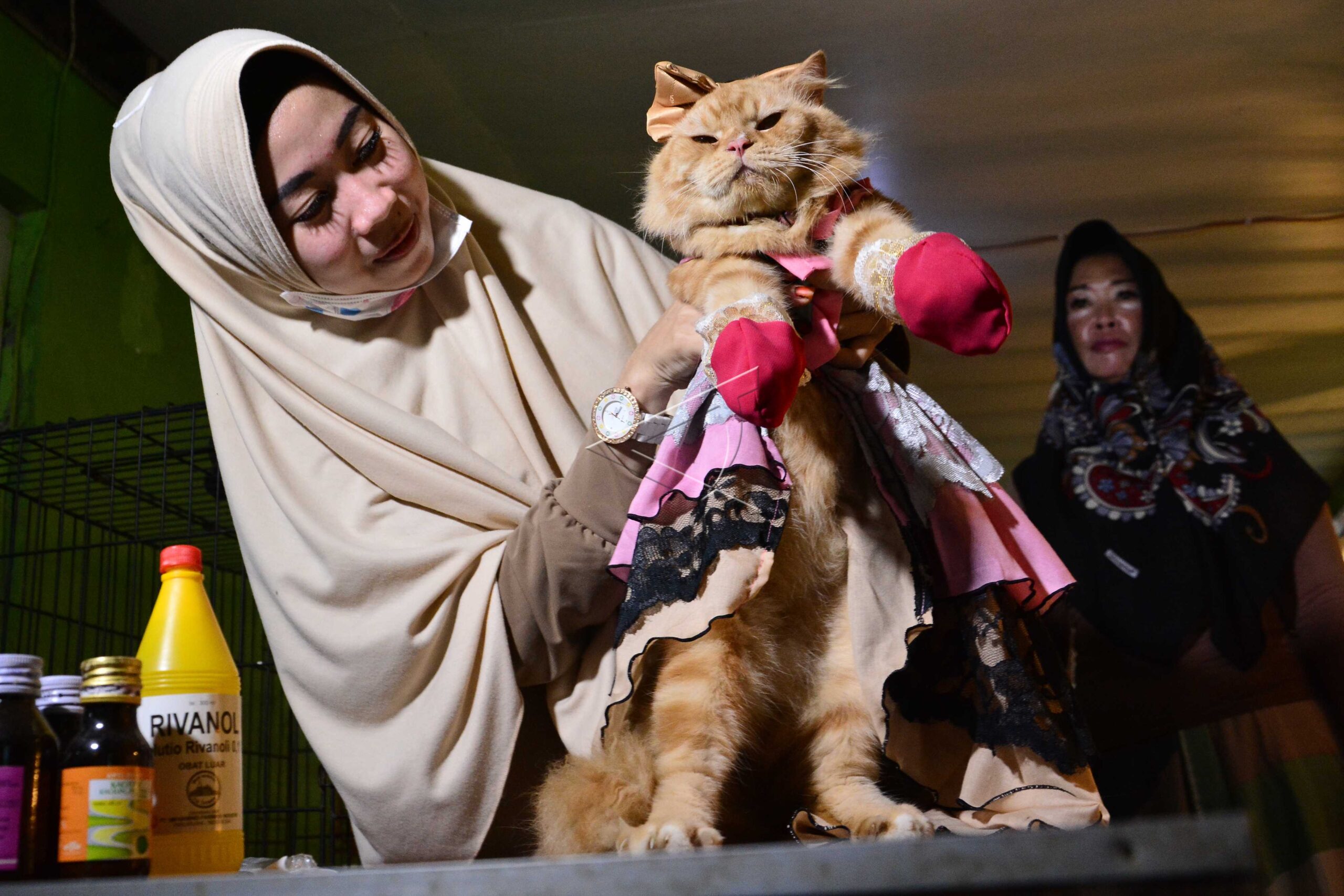 Wahyuni Septiana merawat kucing yang dititipkan di tempat penitipan hewan miliknya di Desa Puton, Kecamatan Diwek, Jombang, Jawa Timur, Selasa (14/5/2019). ANTARA FOTO/Syaiful Arif/dw om.