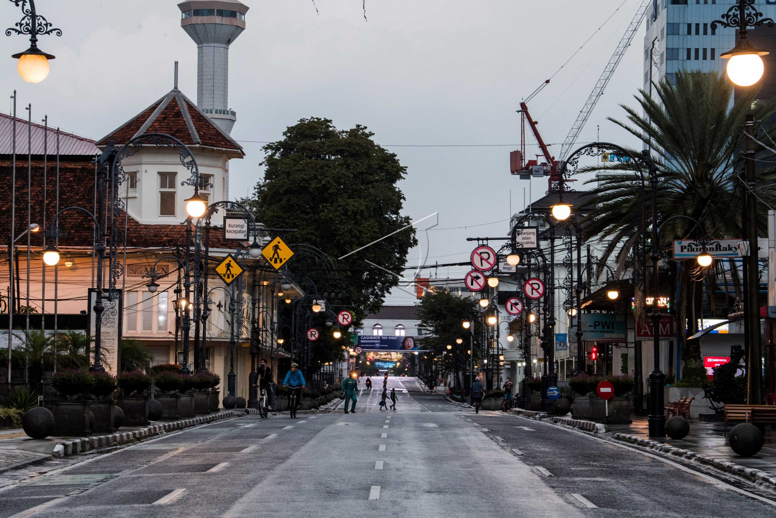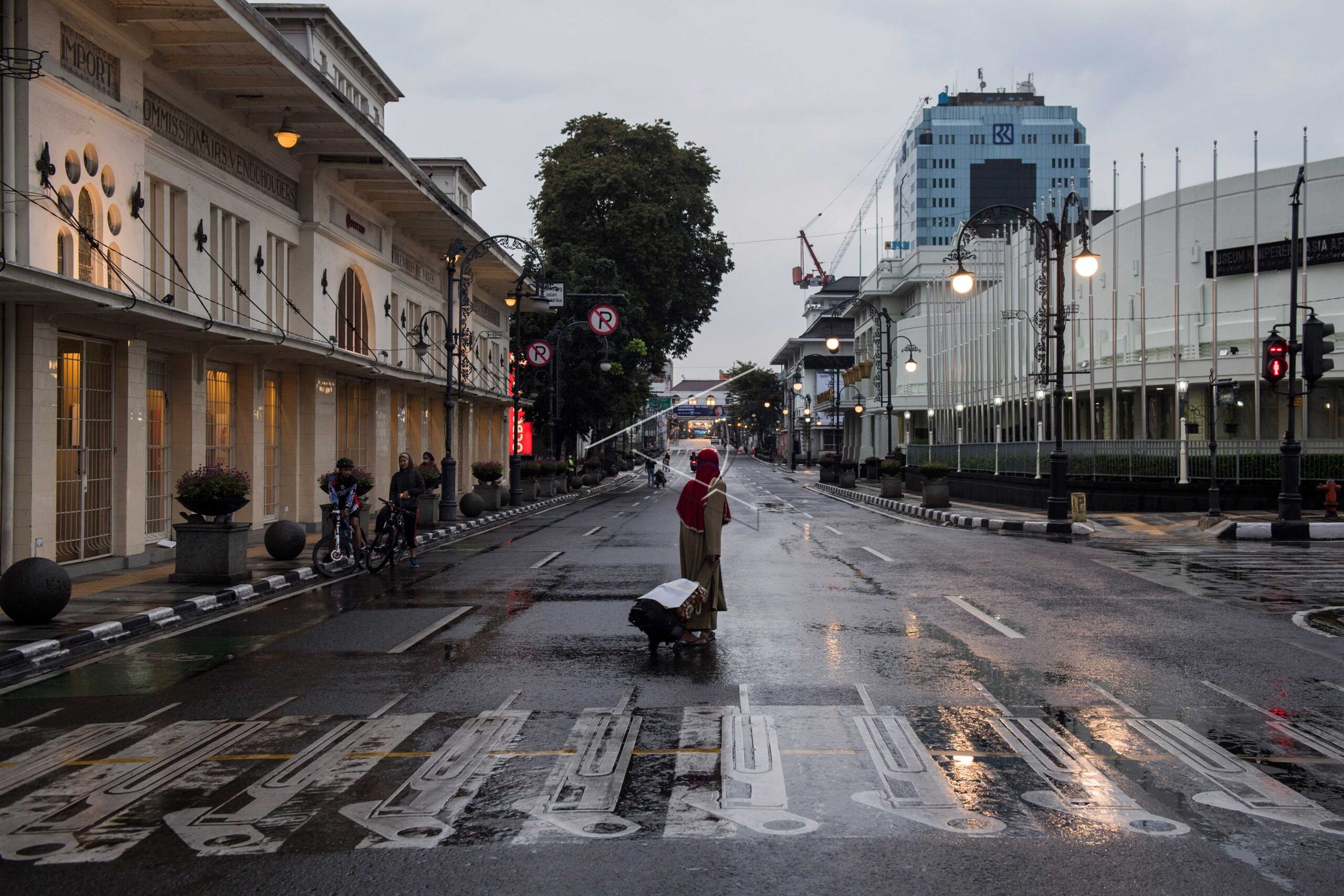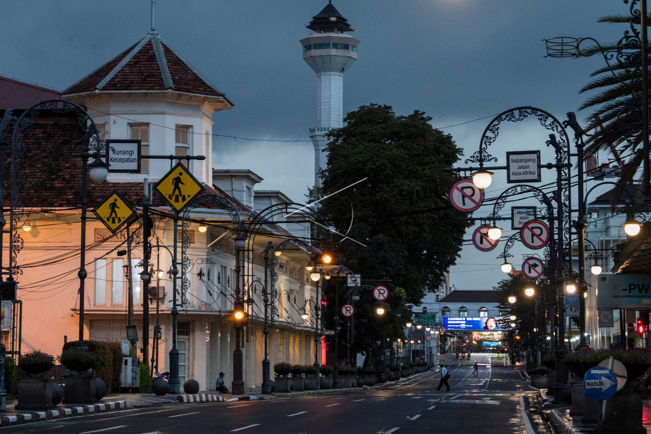 Suasana penutupan Jalan Asia Afrika di Bandung, Jawa Barat, Jumat (17/4/2020). Pembatasan Sosial Berskala Besar (PSBB) dalam rangka percepatan penanganan COVID-19 di Bandung Raya akan diterapkan pada hari Rabu (22/4/2020) mendatang. ANTARA FOTO/M Agung Rajasa/wsj.