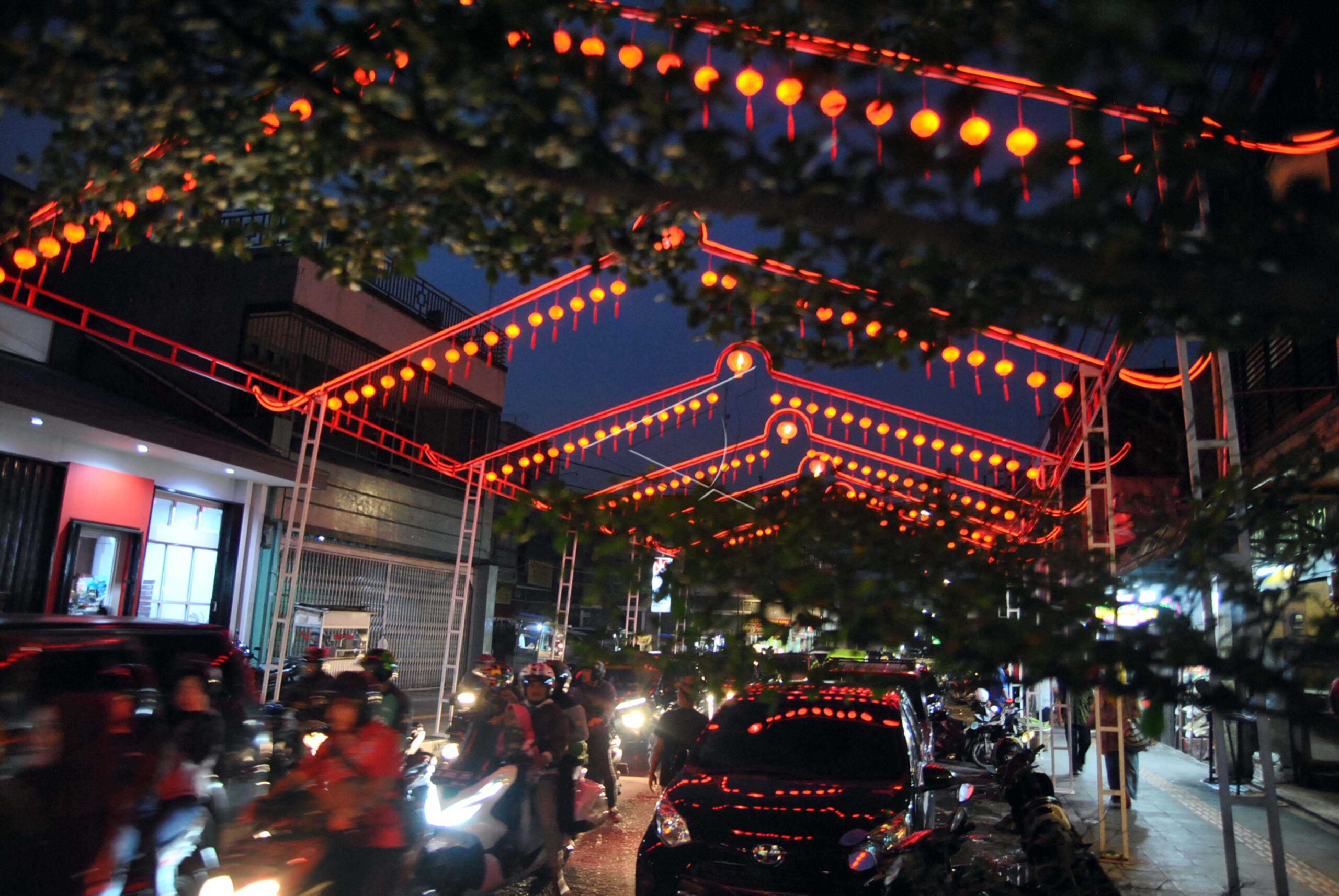 Sejumlah kendaraan melewati hiasan lampion Imlek di kawasan Pecinan, Suryakencana, Kota Bogor, Jawa Barat, Sabtu (18/1/2020). Pemasangan lampion dan menghias gerbang Lawang Suryakancana di kawasan Pecinan, Kota Bogor tersebut untuk menyambut Tahun Baru Imlek 2571. ANTARA FOTO/Arif Firmansyah/pd.