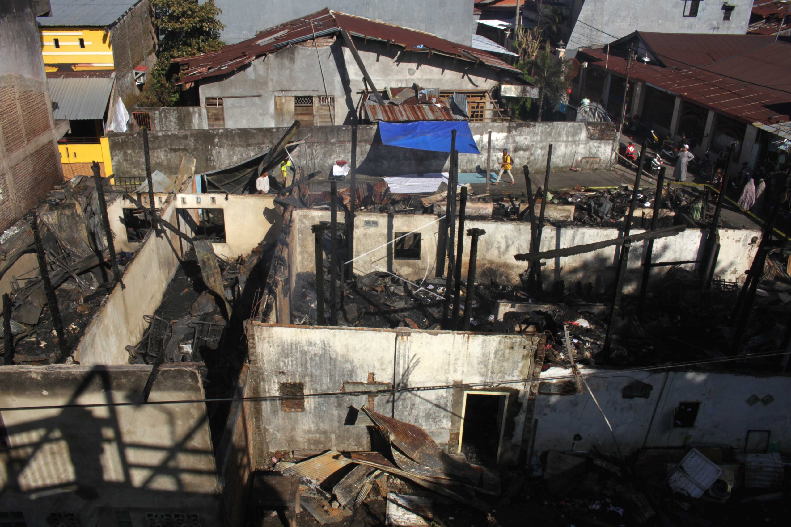 Warga melihat kondisi rumah yang hangus terbakar di Jalan Walisongo, Makassar, Sulawesi Selatan, Minggu (10/5/2020). Kebakaran yang terjadi pada Minggu (10/5) dini hari tersebut menghanguskan tiga unit rumah warga yang diduga akibat korsleting listrik. ANTARA FOTO/Arnas Padda/yu/foc.