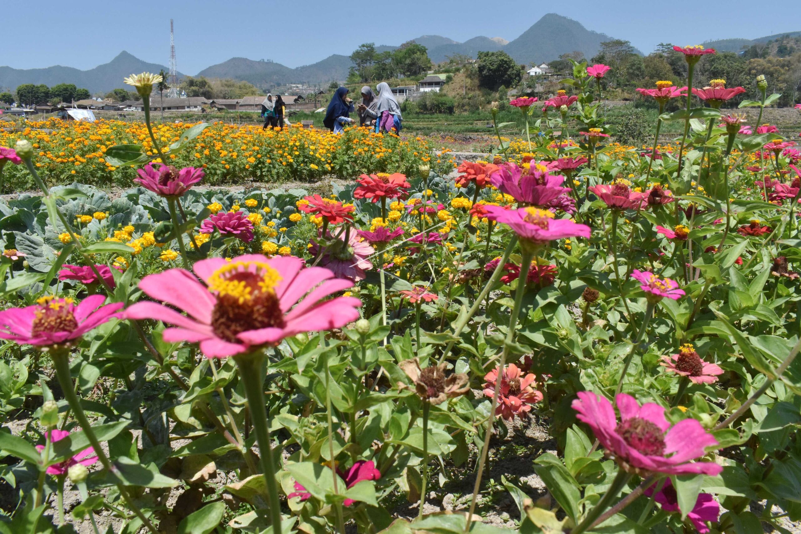 Pengunjung menikmati suasana kebun bunga yang rencananya dikembangan menjadi kawasan agrowisata di Plaosan, Magetan, Jawa Timur, Sabtu (5/10/2019). ANTARA FOTO/Siswowidodo/hp/dw/nym.
