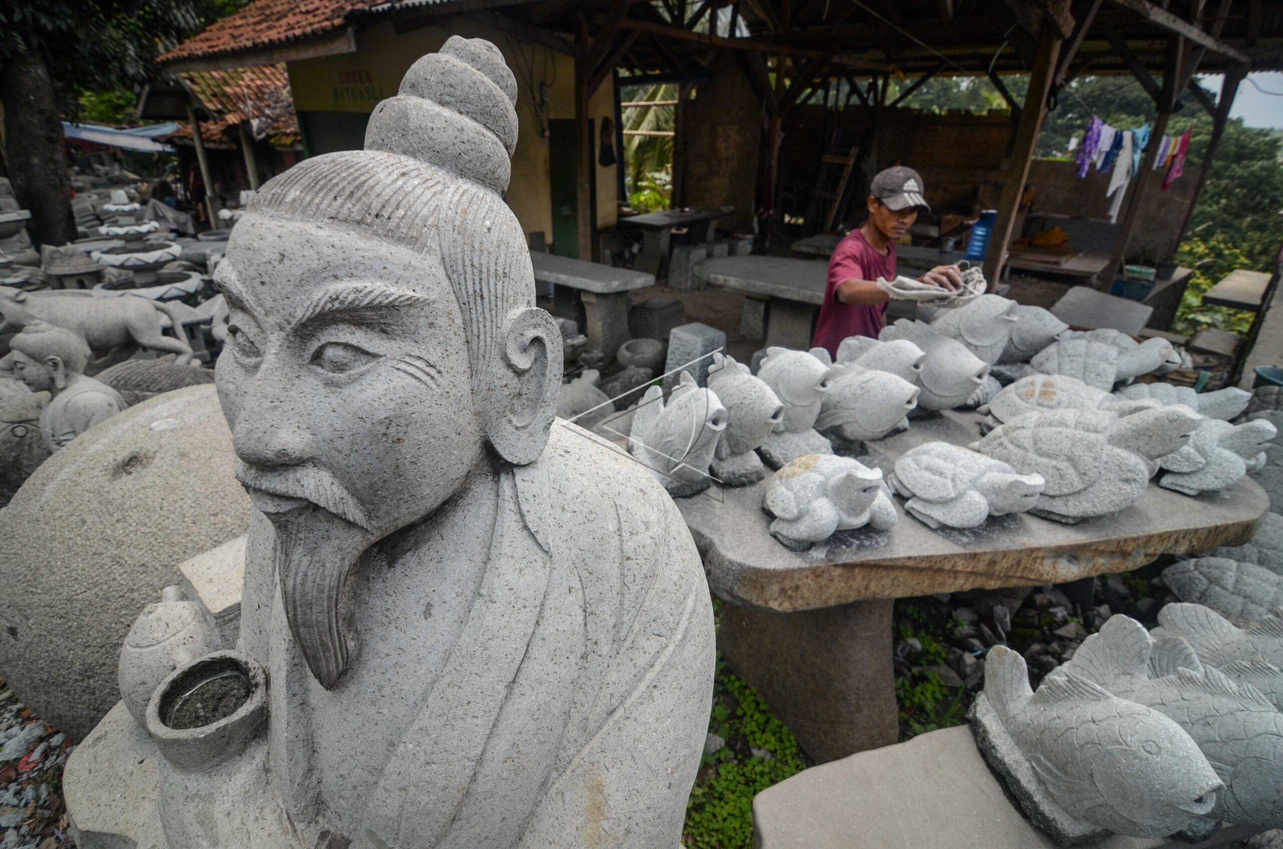 Perajin batu alam membersihkan hiasan patung di Desa Cibogo, Kabupaten Bandung Barat, Jawa Barat, Minggu (4/2/2018). ANTARA FOTO/Raisan Al Farisi/dw/wpa.