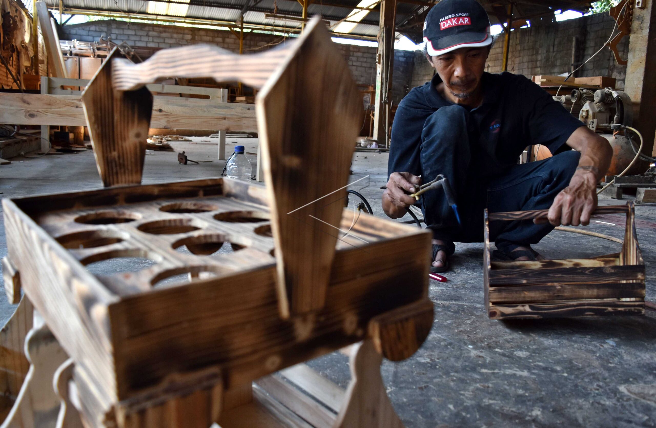 Perajin membuat kerajinan keranjang buah dengan teknik pewarnaan bakar kayu di Rumah Produksi Sabagiriwana, Tengaran, Kabupaten Semarang, Jawa Tengah, Senin (31/7/2017). ANTARA FOTO/Aditya Pradana Putra/dw/wpa.