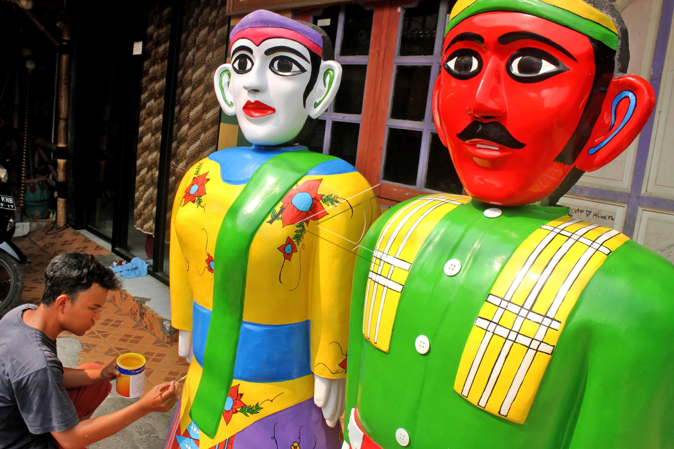 Perajin mengecat ondel-ondel Betawi yang diproduksi di Bekasi, Jawa Barat, Kamis (26/7/2018). ANTARA FOTO/Risky Andrianto/dw/wpa.