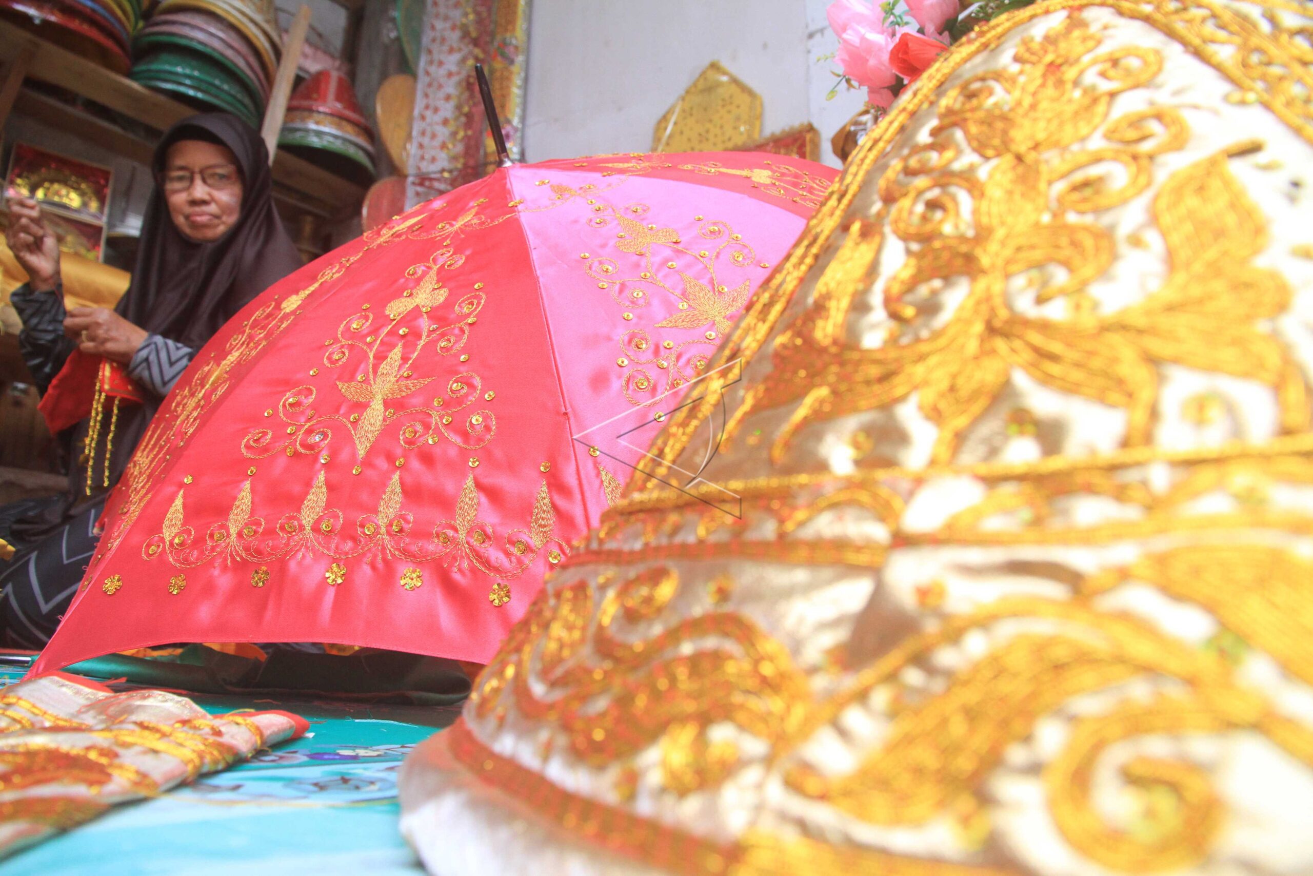 Perajin menyulam tudung saji hias dengan menggunakan kain dan benang emas di Desa Gampong Darat, Kecamatan Johan Pahlawan, Aceh Barat, Aceh, Rabu (18/7/2018). ANTARA FOTO/Syifa Yulinnas/dw/wpa.