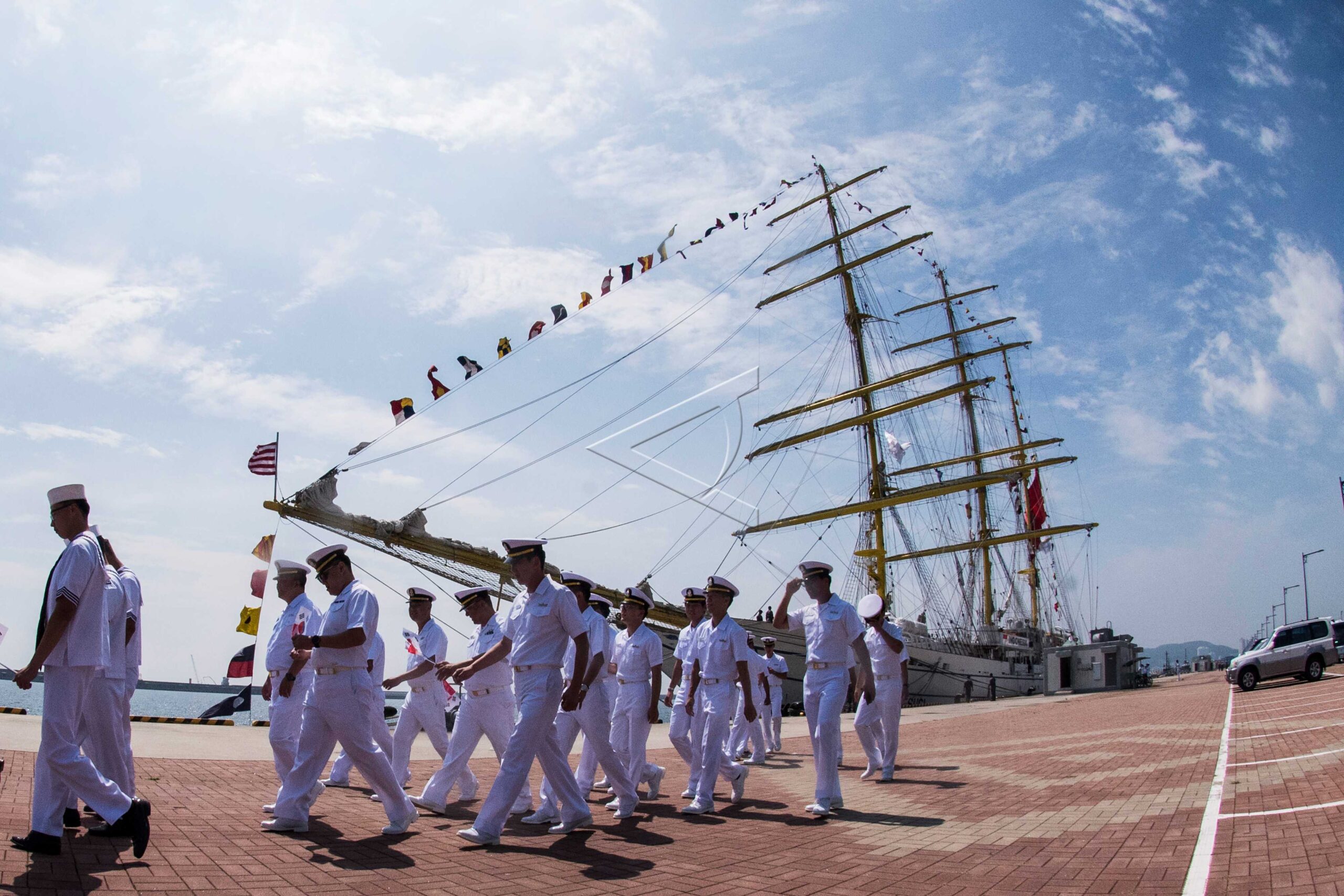 Prajurit AL Korea Selatan melintas di depan KRI Bima Suci saat sandar di Dermaga 3 Republik of Korea Navy, Busan, Korea Selatan, Jumat (30/8/2019). ANTARA FOTO/M Agung Rajasa/foc/dw/nym.
