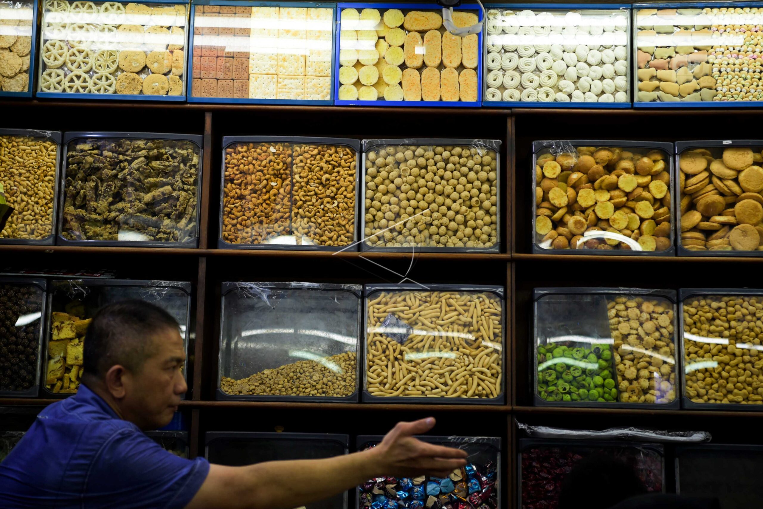 Pedagang merapikan kue kering di pasar Jatinegara, Jakarta, Kamis (30/5/2019). ANTARA FOTO/Galih Pradipta/aww/dw.