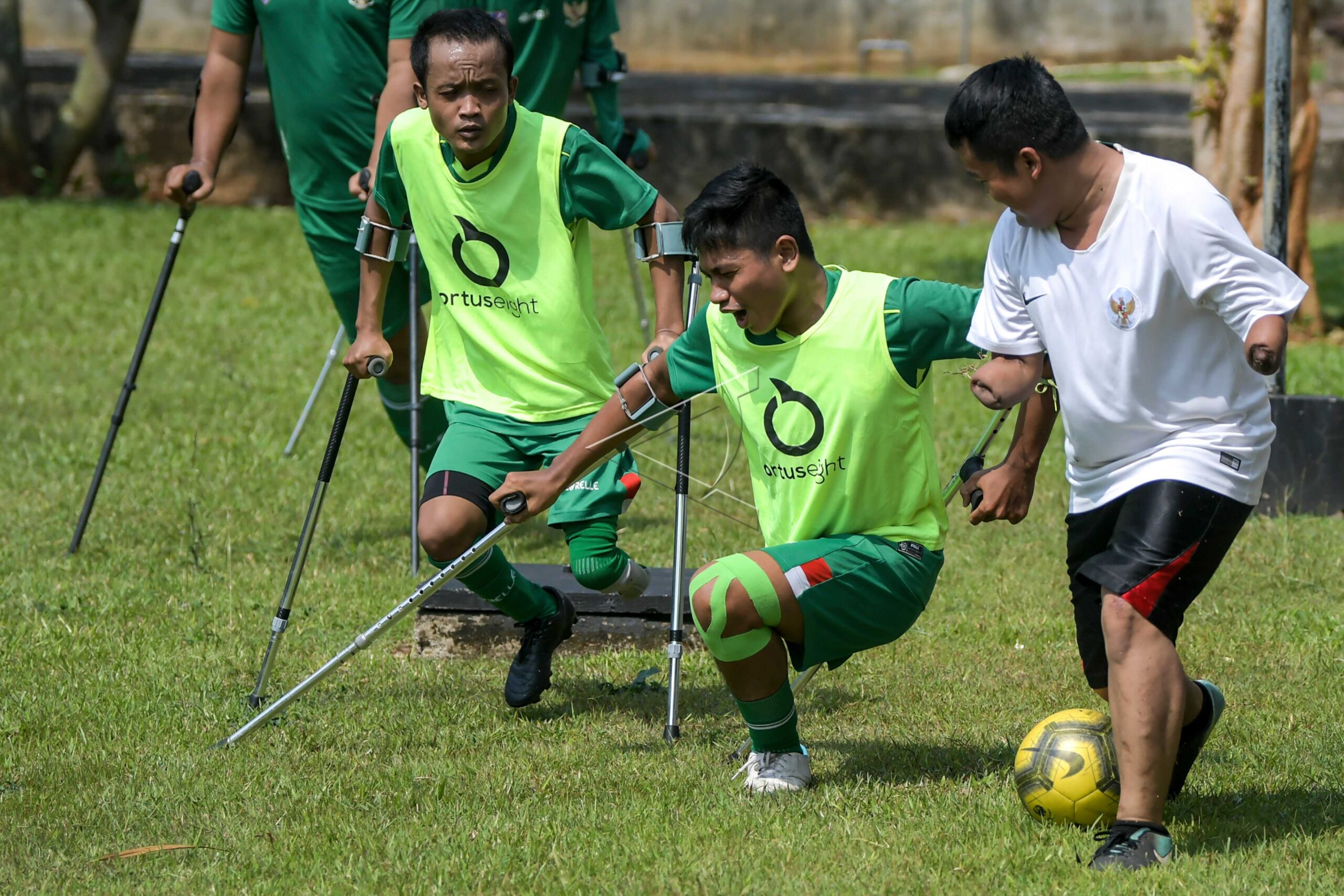 Pesepak bola Tim Garuda Indonesia Amputee Football (INAF) berlatih di Lapangan RS Dr Suyoto di Jakarta, Sabtu (18/7/2020). Timnas Garuda INAF kembali menggelar latihan dalam rangka persiapan pra Piala Asia Amputee Football 2020 Malaysia dan Piala Dunia Sepak Bola Amputasi 2022 di Polandia. ANTARA FOTO/Galih Pradipta/hp.