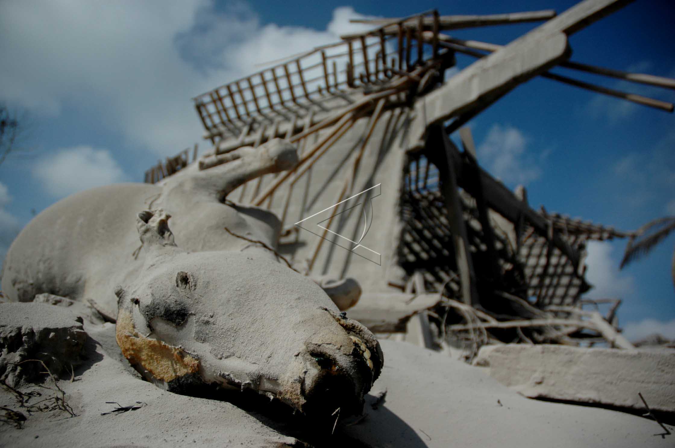 Seekor sapi mati terbakar di Dusun Kinahrejo, Cangkringan, Sleman, Yogyakarta, Rabu (27/10/2010). Jumlah korban letusan Gunung Merapi yang terletak di perbatasan Jawa Tengah dan Daerah Istimewa Yogyakarta pada Selasa (26/10) petang bertambah dari 19 orang menjadi 25 orang. ANTARA FOTO/Noveradika/Koz/hp/asf.