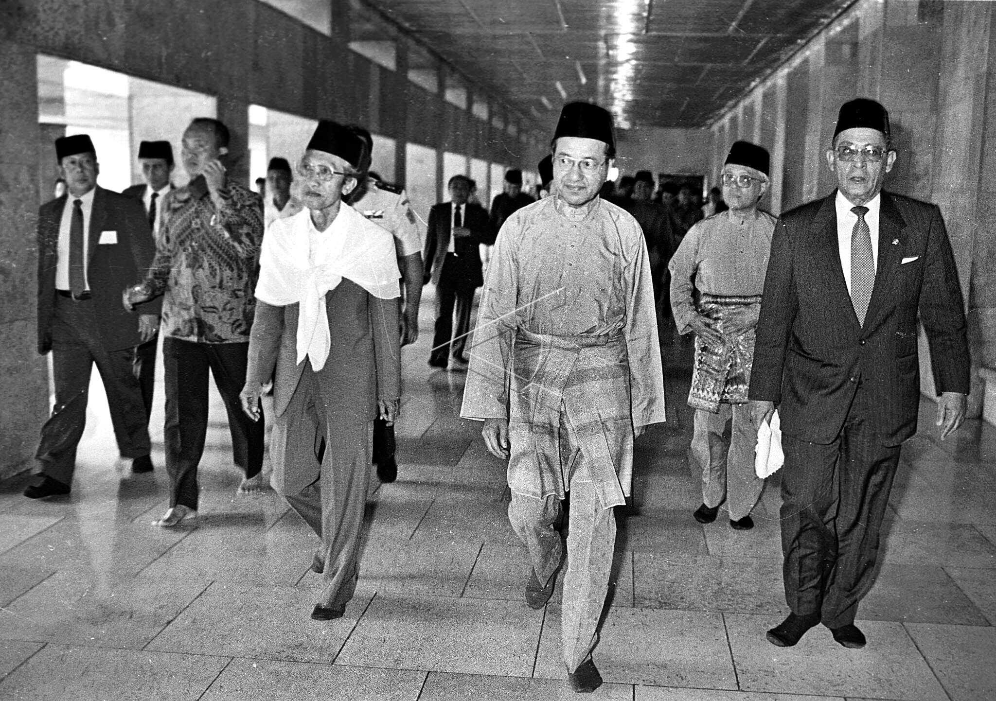 Perdana Menteri Malaysia Mahathir Mohamad (ketiga kanan) bersama Menteri Luar Negeri Ali Alatas (kanan) usai melaksanakan shalat Jumat di Masjid Istiqlal, Jakarta, Jumat (1/3/1991). ANTARA FOTO/PF01/NA/tom.