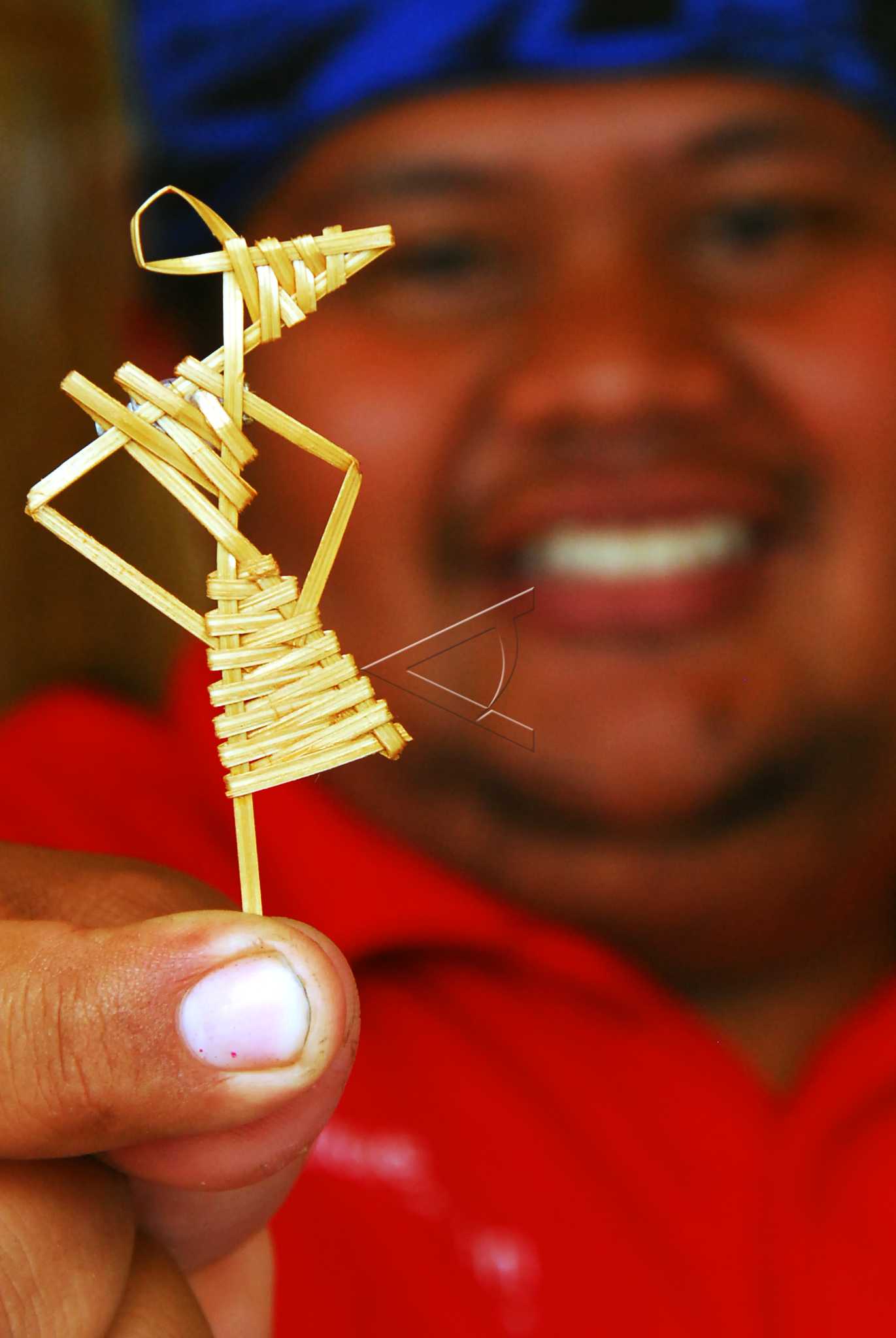Anggota Komunitas Hong Pusat Kajian Mainan dan Permainan Rakyat Cecep Imansah memperlihatkan gogolekan atau wayang mainan, di Bandung, Jawa Barat, Sabtu (7/3/2015). ANTARA FOTO/Agus Bebeng/dw/tom.