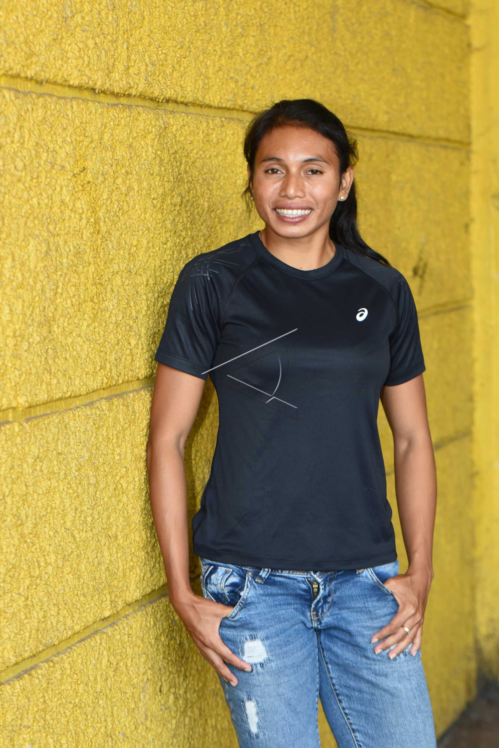 Atlet lompat jauh yang akan berlaga di Olimpiade Rio, Maria Londa berpose di Kawasan Senayan, Jakarta, Selasa (21/6/2016). ANTARA FOTO/Wahyu Putro A/spt/dw/nym.