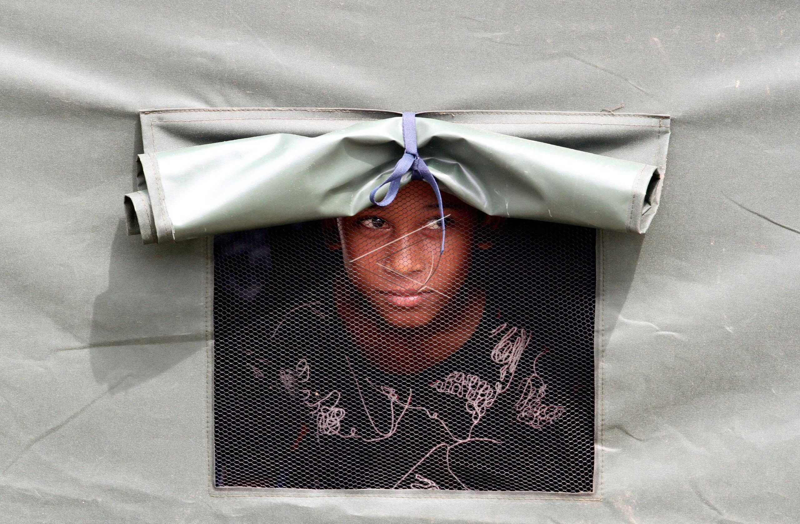 Anak korban gempa melihat keluar dari jendela tenda darurat menjelang berakhirnya masa tanggap darurat kedua di Desa Paru Keude, Pidie Jaya, Provinsi Aceh, Senin (26/12). Masa tanggap darurat gempa di Pidie Jaya tahap kedua akan berakhir pada 27 Desember 2016. ANTARA FOTO/Rahmad/aww/asf.