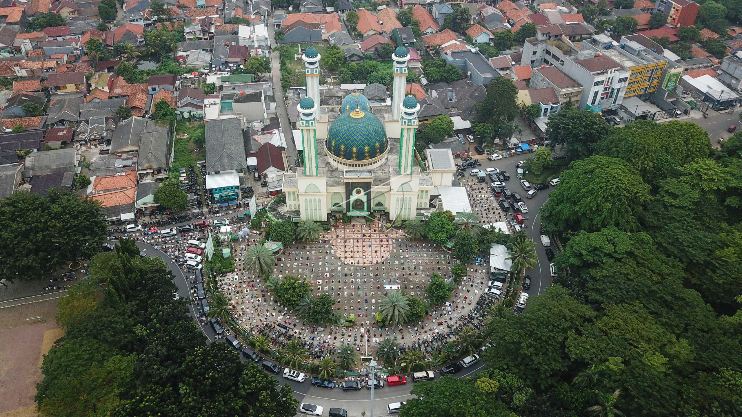 Foto udara ibadah Shalat Jumat di Masjid Agung Al-Barkah, Bekasi, Jawa Barat, Jumat (5/6/2020). ANTARA FOTO/Fakhri Hermansyah/dw/pras.