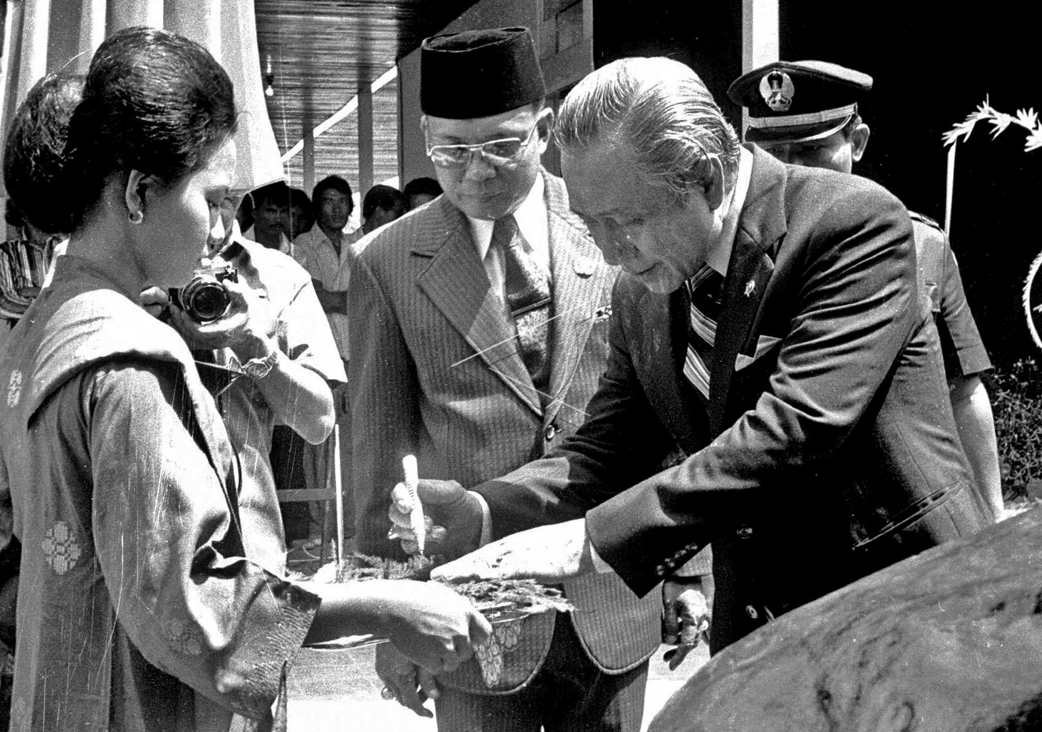 Menteri Dalam Negeri Amirmachmud (kanan) mengambil alat untuk menandatangani prasasti peresmian Kota Administratif Dumai, di Dumai, Riau, Rabu (16/7/1979). ANTARA FOTO/DJ/hm/asf/tom.
