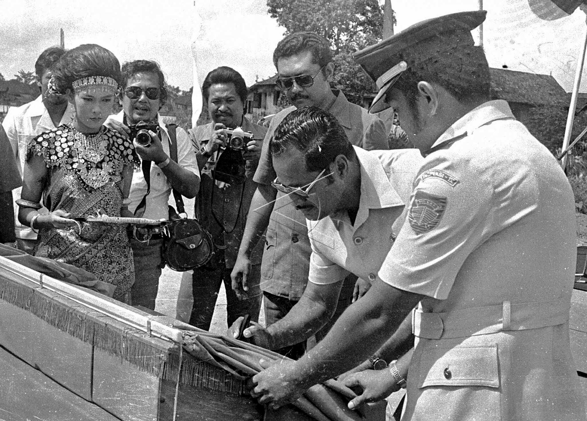 Menteri Perhubungan Roesmin Nuryadin (kedua kanan) menandatangani prasasti peresmian dermaga bus air dan pengoperasian bus air, di Palembang, Sumatera Selatan, Rabu (18/7/1979). ANTARA FOTO/EK/hm/asf/tom.