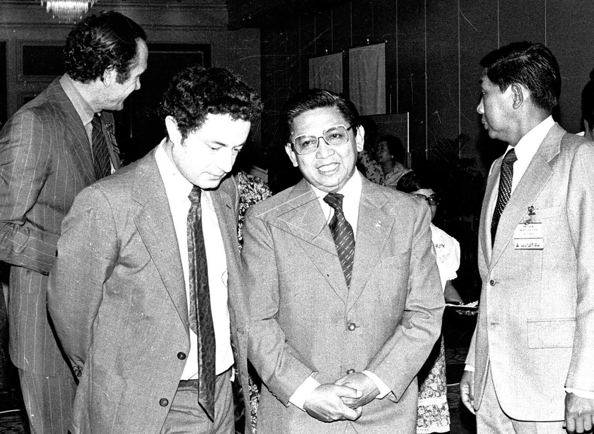 Menteri Kesehatan Soewardjono Soerjaningrat (kedua kanan) beramah tamah dengan para ahli penyakit jantung dari dalam dan luar negeri pada pembukaan Simposium Yayasan Jantung Indonesia Dewi Sartika, di Jakarta, Sabtu (31/3/1979). ANTARA FOTO/Mawardi Muis/hm/asf/tom.