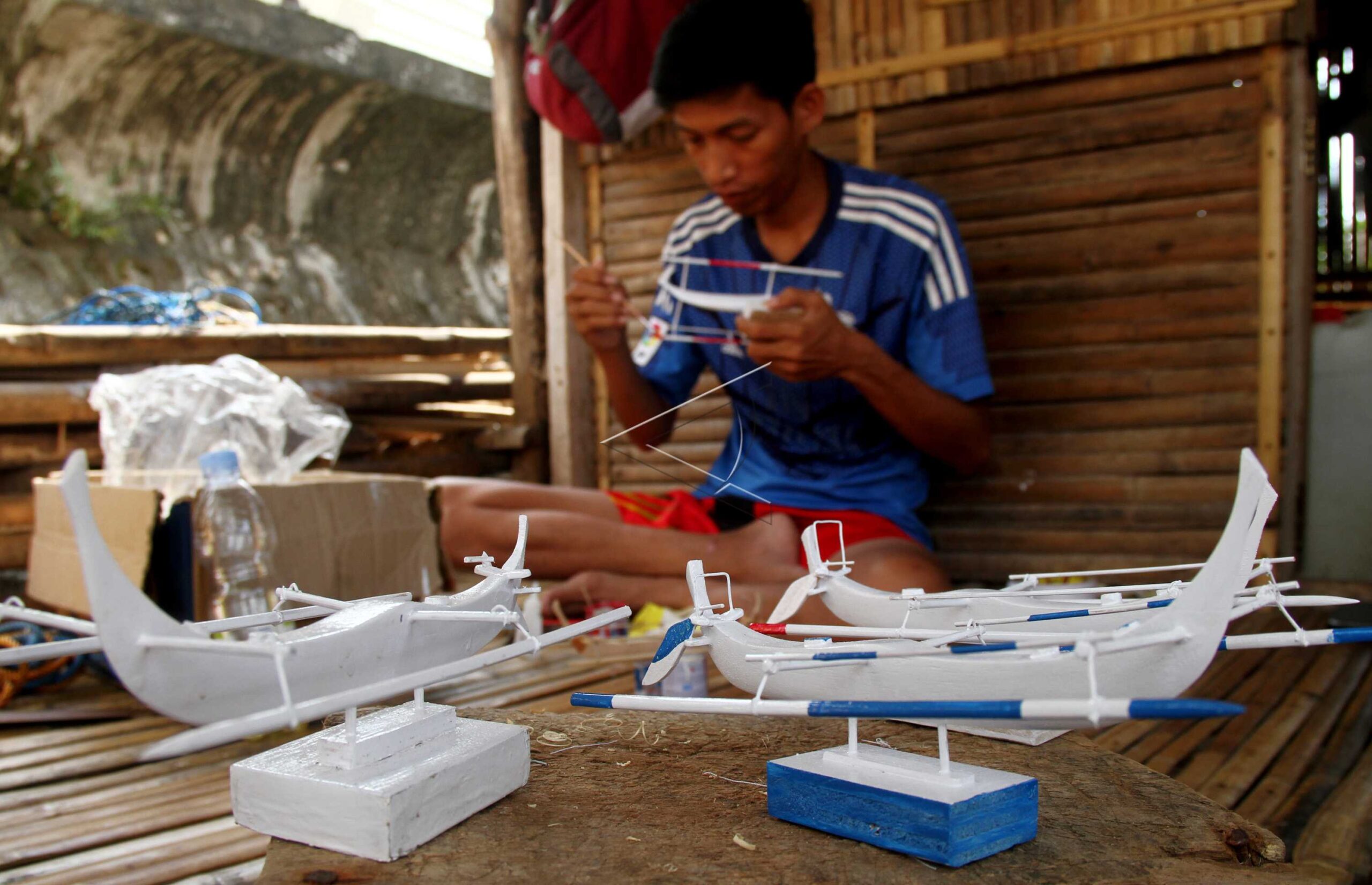 Perajin membuat miniatur perahu sandeq di Mamuju, Sulawesi Barat, Jumat (20/7/2018). ANTARA FOTO/Akbar Tado/dw/wpa.