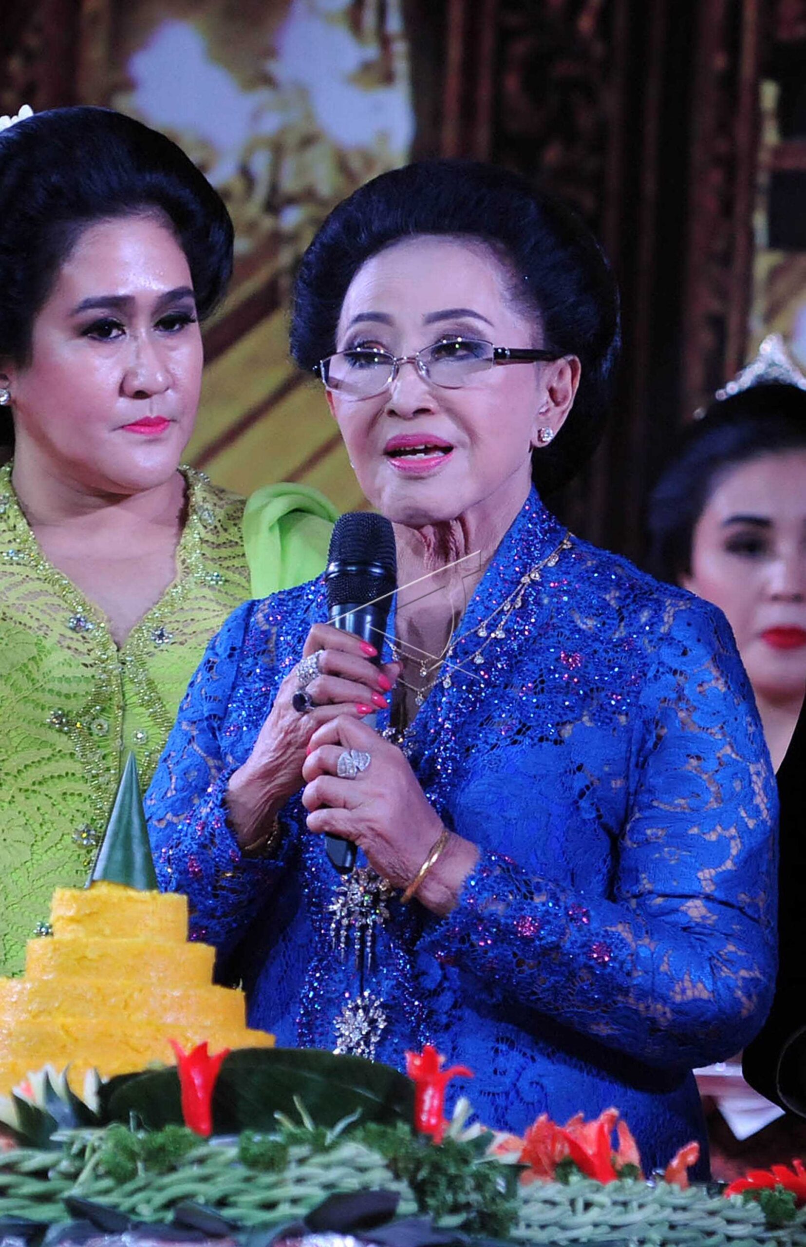 Pendiri PT Mustika Ratu dan Yayasan Puteri Indonesia BRA Mooryati Soedibyo mengucap syukur sesaat akan memotong tumpeng Warso Windu Ageng dalam acara syukuran perayaan ulang tahunnya yang ke 88 di Jakarta, Selasa (5/1/2016). ANTARA FOTO/Teresia May/foc/dw/nym.