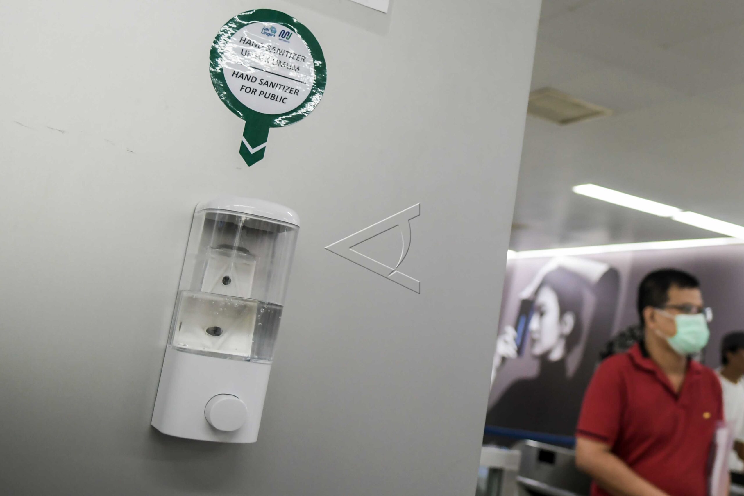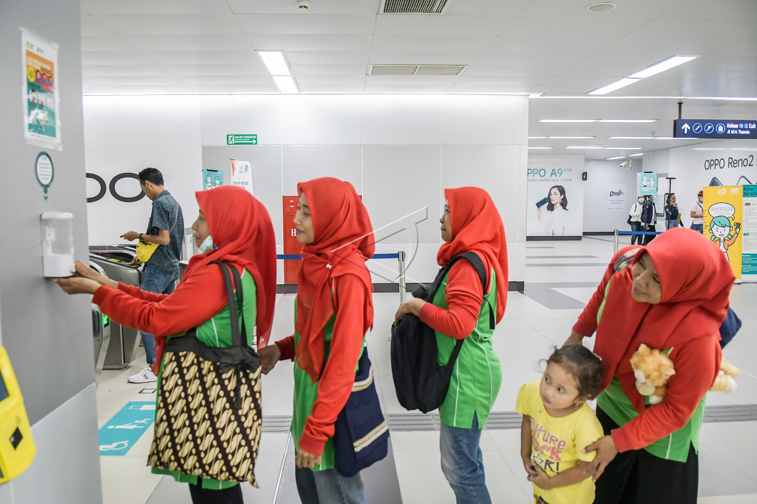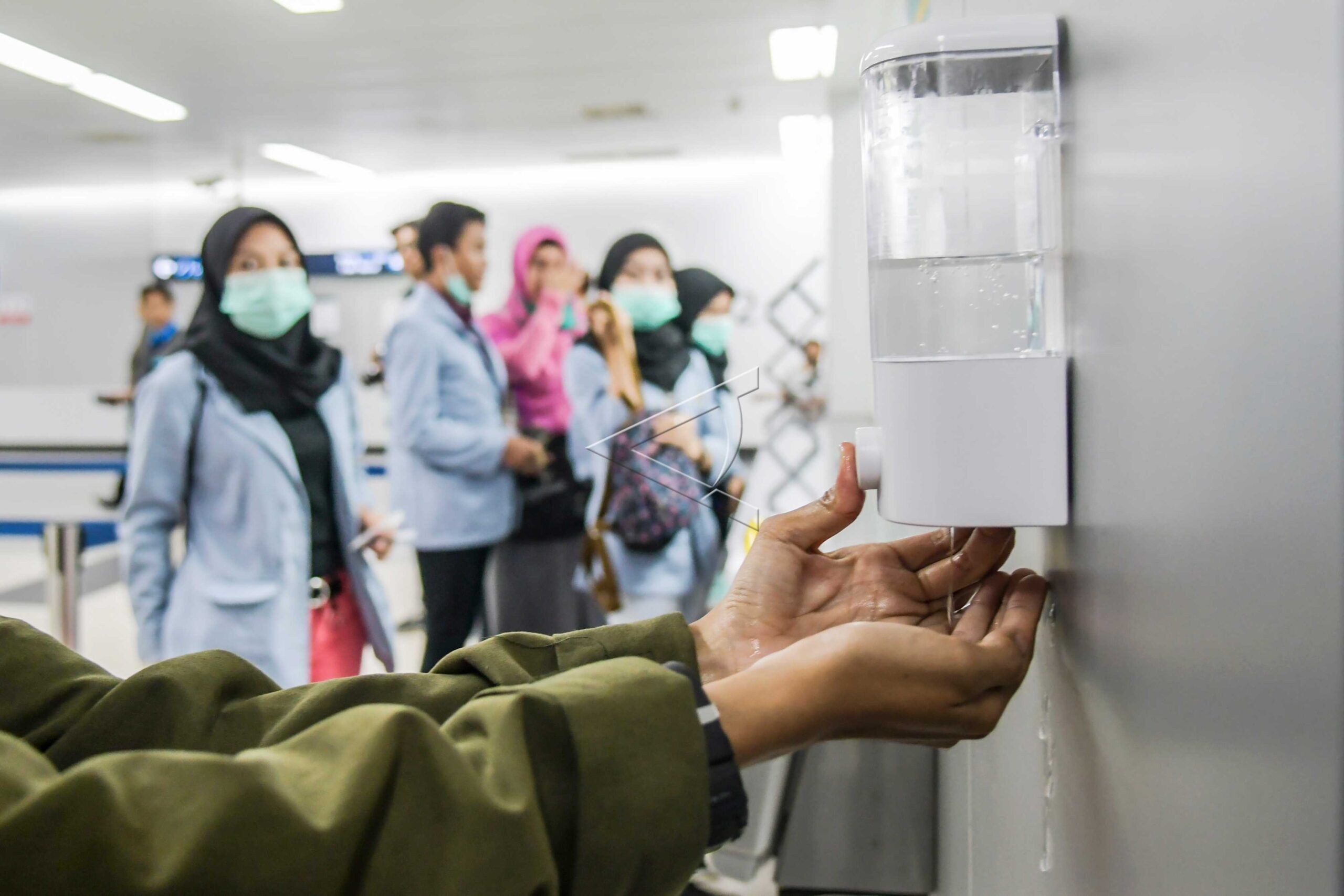 Penumpang menggunakan antiseptik atau hand sanitizer di Stasiun MRT Bundaran HI, Jakarta, Selasa (3/3/2020). PT MRT menyediakan antiseptik di setiap stasiun guna menghambat penyebaran virus Covid-19 (Corona Virus Desease). ANTARA FOTO/Galih Pradipta/pd