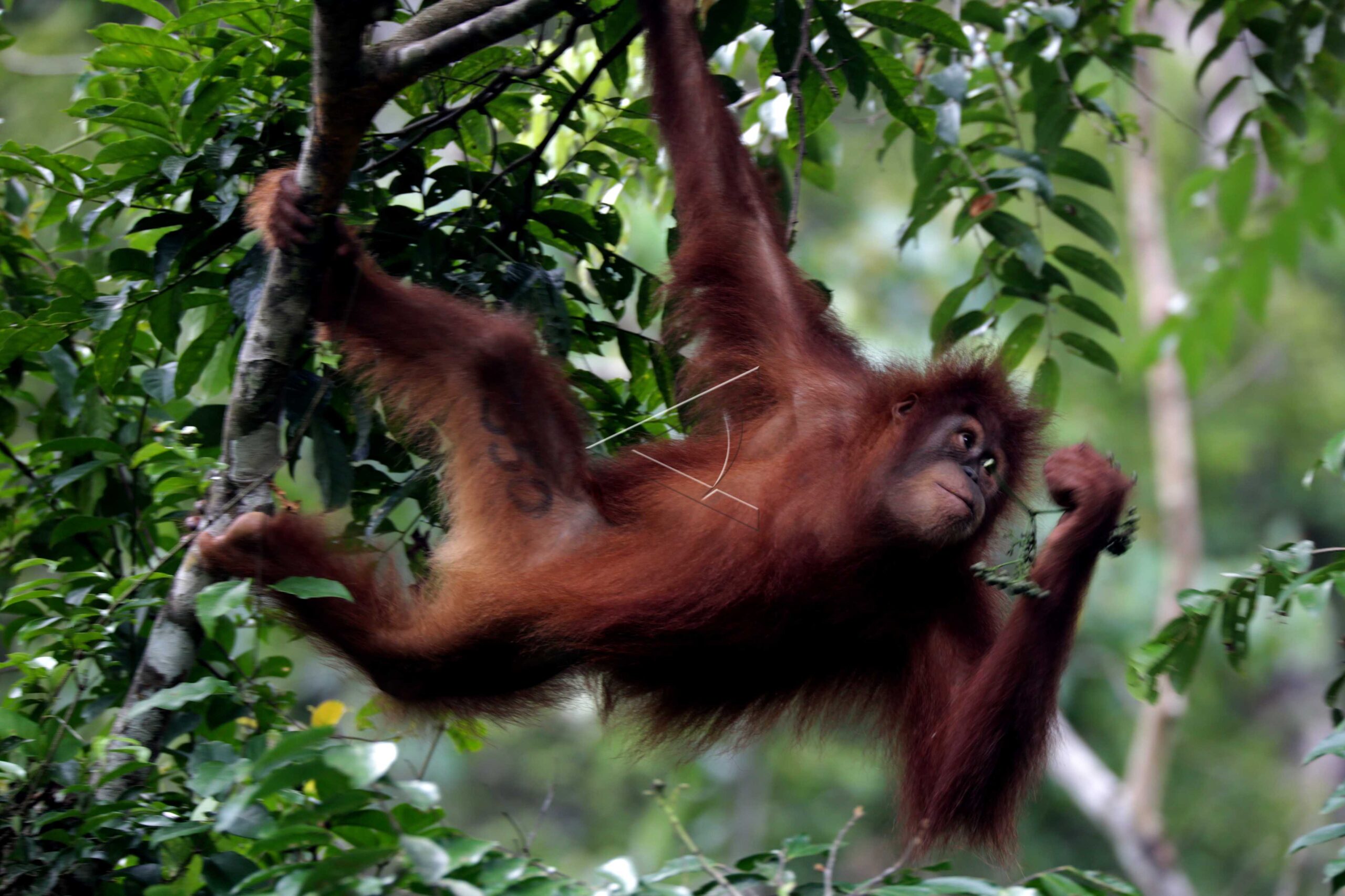 Salah satu dari dua orangutan Sumatra (Pongo abelli) yang dilepasliarkan kembali kehabitatnya oleh Yayasan Ekosisem Leuser (YEL) dan Balai Konservasi Sumber Daya Alam (BKSDA) Aceh di kawasan hutan reintroduksi cagar Alam Jantho, Aceh Besar, Aceh, Selasa (18/06/2019). ANTARA FOTO /Irwansyah Putra/dw/tom.