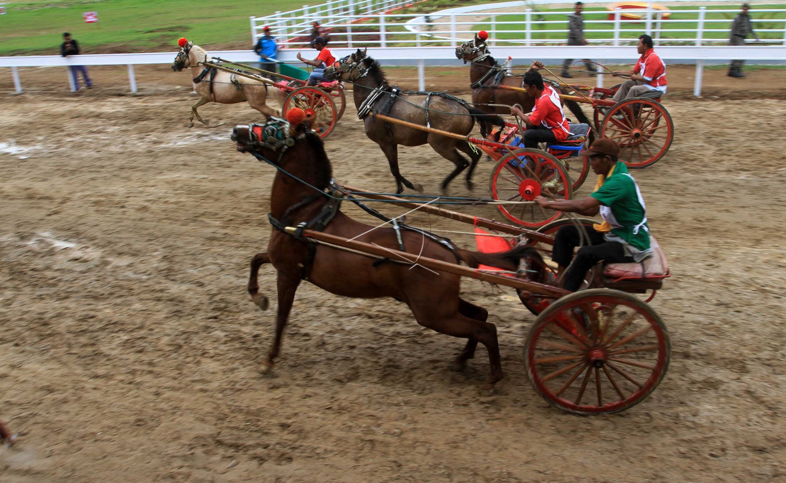 Penunggang Pacu Kuda Bugih berlaga dalam pertandingan Pacu Kuda Tradisional dan Nasional 2016 di Gelanggang Pacu Kuda Bukit Ambacang, Bukittinggi, Sumatra Barat, Minggu (25/12/2016). ANTARA FOTO/Muhammad Arif Pribadi/kye/dw/wpa.