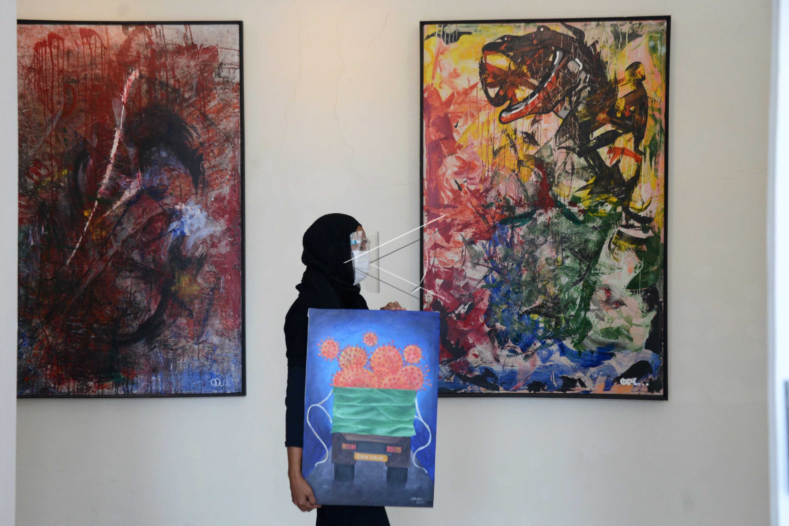 Seniman dari kelompok seni Kana ART Institute dengan alat pelindung dan masker di wajahnya membawa lukisan saat pengambilan video untuk pameran secara virtual di Galeri Seni Taman Budaya Aceh, Banda Aceh, Aceh, Sabtu (18/7/2020). Pameran virtual karya seniman Aceh berupa lukisan masker, Virus Corona dan aktivitas masyarakat itu bertujuan untuk memberikan inspirasi kepada warga agar […]