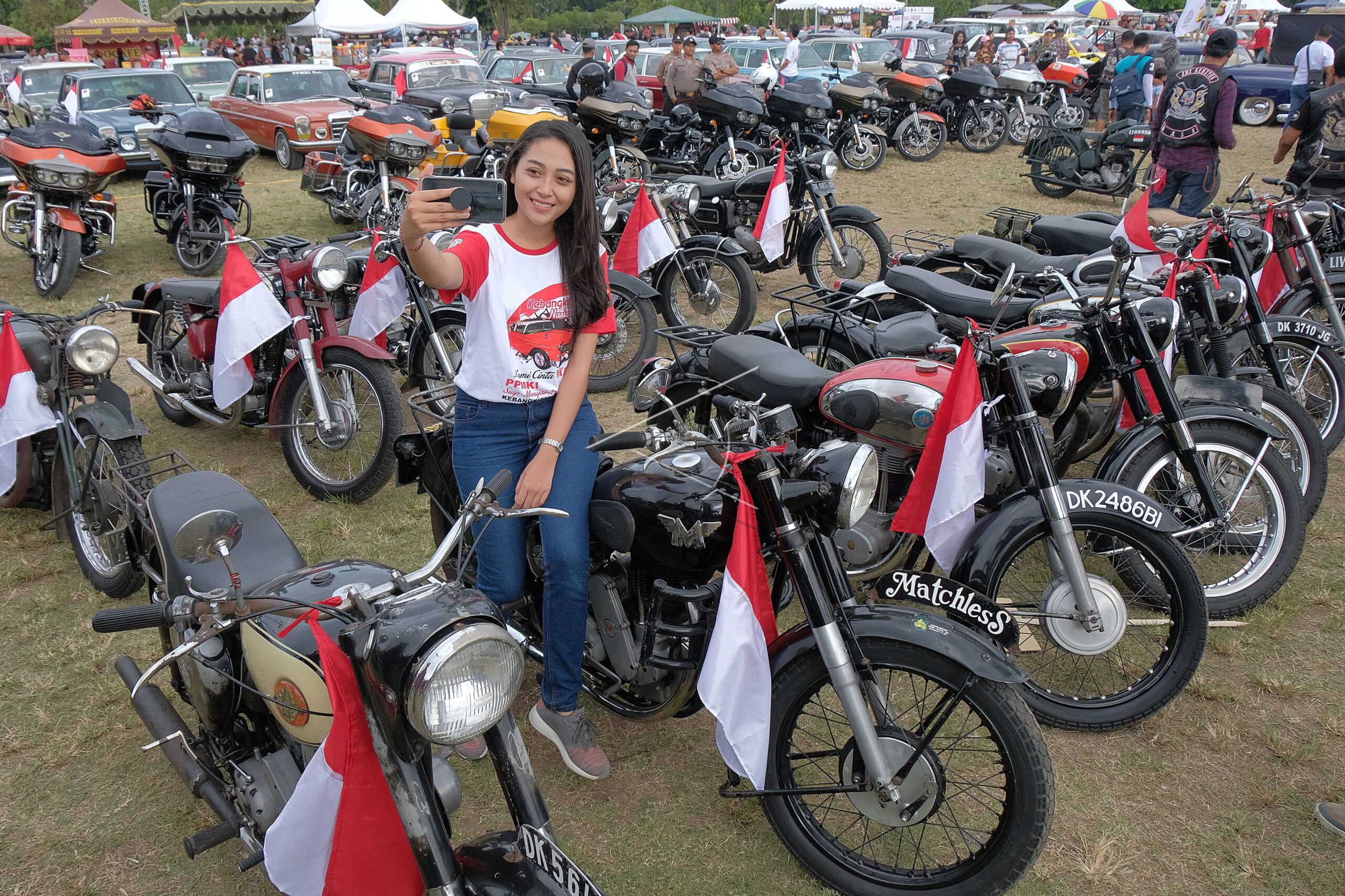 Pengunjung berswafoto dengan latar belakang motor tua dan klasik dalam pameran mobil/motor antik untuk menyambut Hari Kebangkitan Nasional dan tercatat dalam rekor MURI di Denpasar, Bali, Sabtu (18/5/2019). ANTARA FOTO/Nyoman Hendra Wibowo/hp/dw/nym.