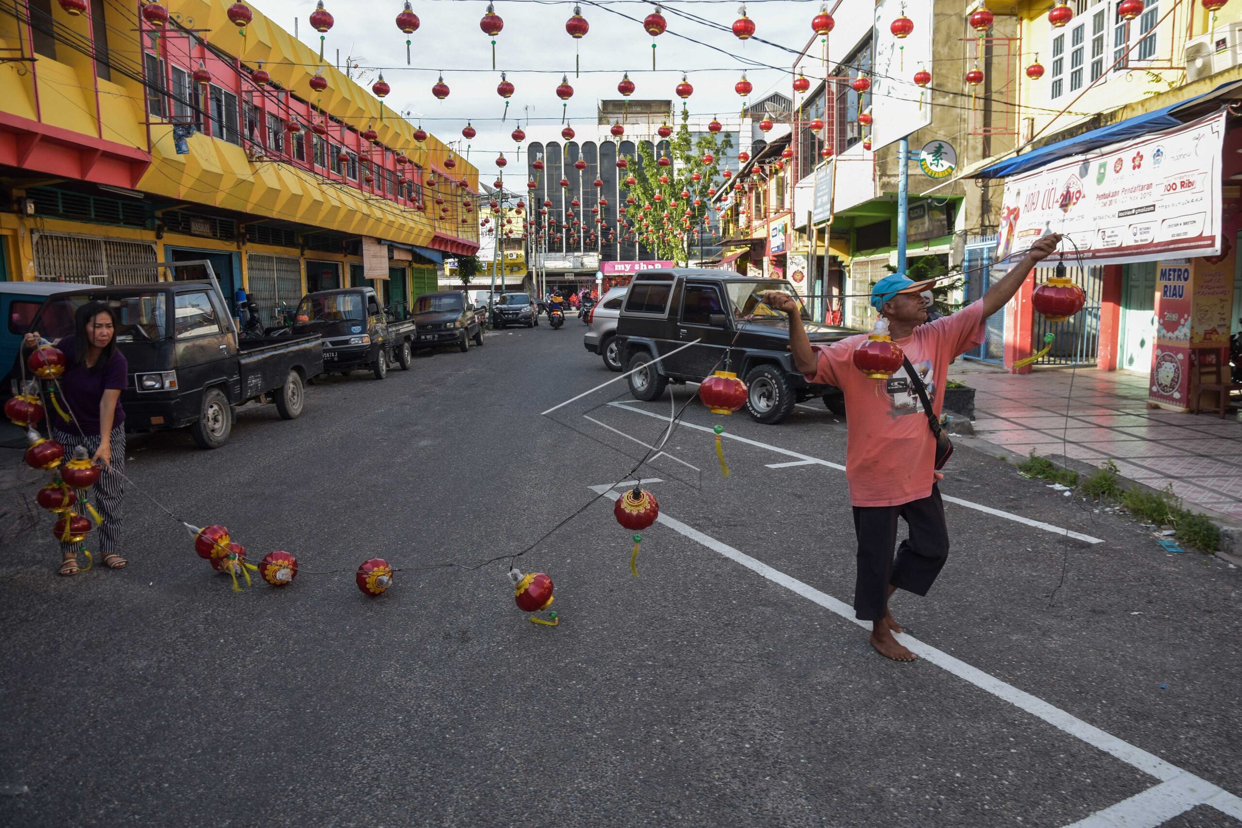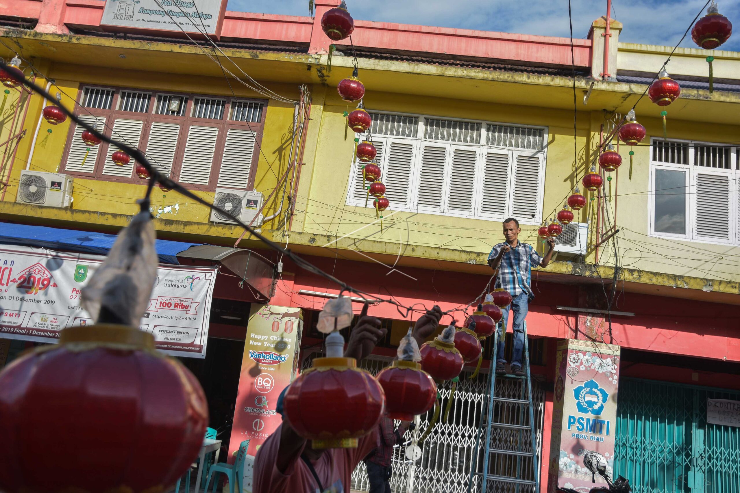 Sejumlah warga memasang lampion untuk persiapan Imlek di Jalan Karet Kota Pekanbaru, Riau, Rabu (8/1/2020). Jalan Karet selama ini dikenal sebagai pusat aktivitas warga peranakan Tionghoa di Pekanbaru, yang menjadi lokasi penyelenggaraan Tahun Baru Imlek. ANTARA FOTO/FB Anggoro/foc.